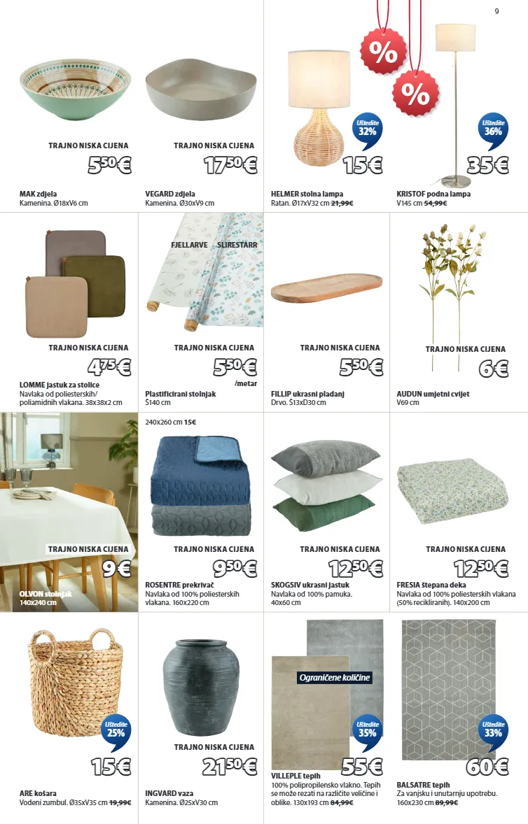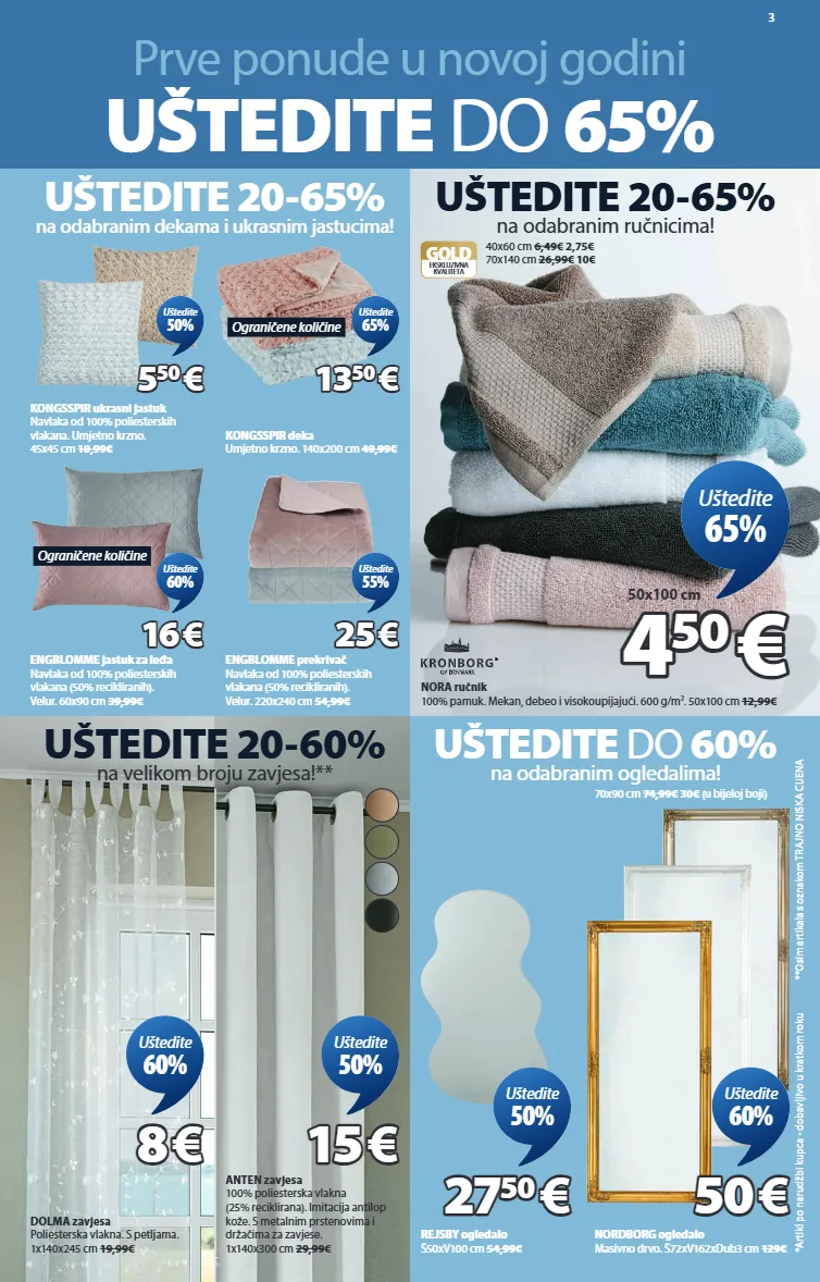 3 prve ponude u novoj godini uštedite do 65% uštedite 20-65% na odabranim dekama i ukrasnim jastucima! kongsspir ukrasni jastuk navlaka od 100% poliesterskih vlakana. umjetno krzno. 45x45 cm 10,99€ 5 5 50 50 € € uštedite 50% ograničene količine kongsspir deka umjetno krzno. 140x200 cm 49,99€ 13 13 50 50 € € uštedite 65% engblomme jastuk za leđa navlaka od 100% poliesterskih vlakana (50% recikliranih). velur. 60x90 cm 39,99€ 16 16 € € uštedite 60% ograničene količine engblomme prekrivač navlaka od 100% poliesterskih vlakana (50% recikliranih). velur. 220x240 cm 54,99€ 25 25 € € uštedite 55% uštedite 20-65% na odabranim ručnicima! nora ručnik 100% pamuk. mekan, debeo i visokoupijajući. 600 g/m². 50x100 cm 12,99€ gold ekskluzivna kvaliteta 40x60 cm 6,49€ 2,75€ 70x140 cm 26,99€ 10€ 4 4 50 50 € € 50x100 cm uštedite 65% uštedite 20-60% na velikom broju zavjesa!** dolma zavjesa poliesterska vlakna. s petljama. 1x140x245 cm 19,99€ 8 8 € € uštedite 60% anten zavjesa 100% poliesterska vlakna (25% reciklirana). imitacija antilop kože. s metalnim prstenovima i držačima za zavjese. 1x140x300 cm 29,99€ 15 15 € € uštedite 50% uštedite do 60% na odabranim ogledalima! rejsby ogledalo š50xv100 cm 54,99€ 27 27 50 50 € € uštedite 50% nordborg ogledalo masivno drvo. š72xv162xdub3 cm 129€ 70x90 cm 74,99€ 30€ (u bijeloj boji) 50 50 € € uštedite 60% *artikl po narudžbi kupca - dobavljivo u kratkom roku **osim artikala s oznakom trajno niska cijena 6865342 6883244 4539042 4539119 6884642 6884718 4614842 4615018 2101601 5089401 5097600 5097663 5097642 5097627 5097607 3670123 3805006 3805055 3805075