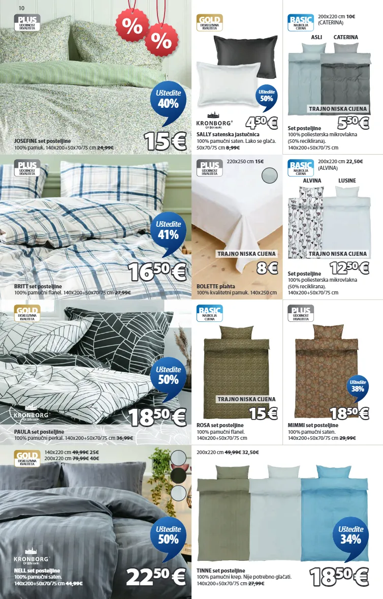10 plus udobnost i kvaliteta josefine set posteljine 100% pamuk. 140x200+50x70/75 cm 24,99€ 15 15 € € uštedite 40% plus udobnost i kvaliteta britt set posteljine 100% pamučni flanel. 140x200+50x70/75 cm 27,99€ 16 16 50 50 € € uštedite 41% gold ekskluzivna kvaliteta paula set posteljine 100% pamučni perkal. 140x200+50x70/75 cm 36,99€ 18 18 50 50 € € uštedite 50% gold ekskluzivna kvaliteta nell set posteljine 100% pamučni saten. 140x200+50x70/75 cm 44,99€ 140x220 cm 49,99€ 25€ 200x220 cm 79,99€ 40€ 22 22 50 50 € € uštedite 50% tinne set posteljine 100% pamučni krep. nije potrebno glačati. 140x200+50x70/75 cm 27,99€ 200x220 cm 49,99€ 32,50€ 18 18 50 50 € € uštedite 34% gold ekskluzivna kvaliteta sally satenska jastučnica 100% pamučni saten. lako se glača. 50x70/75 cm 8,99€ 4 4 50 50 € € uštedite 50% basic najbolja cijena set posteljine 100% poliesterska mikrovlakna (50% reciklirana). 140x200+50x70/75 cm asli 200x220 cm 10€ (caterina) 5 5 50 50 € € trajno niska cijena caterina plus udobnost i kvaliteta bolette plahta 100% kvalitetni pamuk. 140x250 cm 220x250 cm 15€ 8 8 € € trajno niska cijena set posteljine 100% poliesterska mikrovlakna (50% reciklirana). 140x200+50x70/75 cm alvina lusine 12 12 50 50 € € trajno niska cijena basic najbolja cijena rosa set posteljine 100% pamučni flanel. 140x200+50x70/75 cm 15 15 € € trajno niska cijena plus udobnost i kvaliteta mimmi set posteljine 100% pamučni saten. 140x200+50x70/75 cm 29,99€ 18 18 50 50 € € uštedite 38% 200x220 cm 22,50€ (alvina) basic najbolja cijena 7390280 7360780 1843680 7391780 7391680 1845580 7391580 7393080 1838680 7393380 1060801 1060842 1820780 1821180 1439001 1439058 1821780 7399080 7399180 1830580
