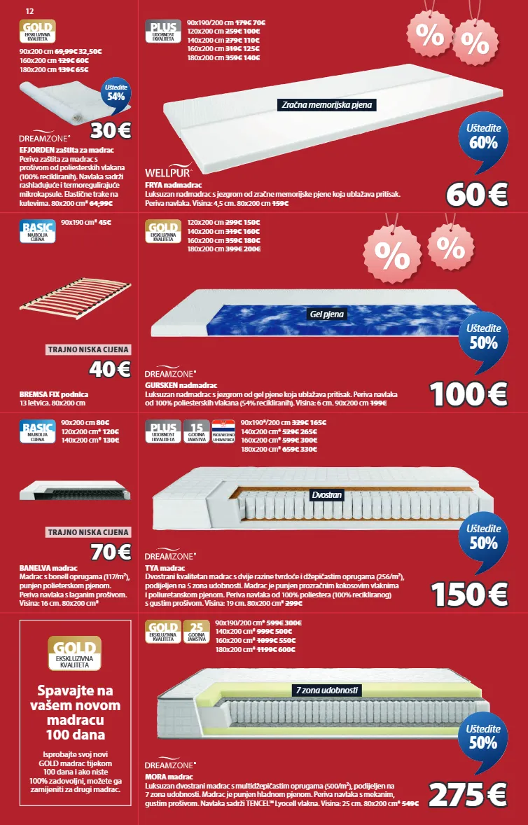 12 zračna memorijska pjena plus udobnost i kvaliteta frya nadmadrac luksuzan nadmadrac s jezgrom od zračne memorijske pjene koja ublažava pritisak. periva navlaka. visina: 4,5 cm. 80x200 cm 159€ 90x190/200 cm 179€ 70€ 120x200 cm 259€ 100€ 140x200 cm 279€ 110€ 160x200 cm 319€ 125€ 180x200 cm 359€ 140€ 60 60 € € uštedite 60% gel pjena gold ekskluzivna kvaliteta gursken nadmadrac luksuzan nadmadrac s jezgrom od gel pjene koja ublažava pritisak. periva navlaka od 100% poliesterskih vlakana (54% recikliranih). visina: 6 cm. 90x200 cm 199€ 120x200 cm 299€ 150€ 140x200 cm 319€ 160€ 160x200 cm 359€ 180€ 180x200 cm 399€ 200€ 100 100 € € uštedite 50% dvostran plus udobnost i kvaliteta 15 godina jamstva proizvedeno u hrvatskoj tya madrac dvostrani kvalitetan madrac s dvije razine tvrdoće i džepičastim oprugama (256/m²), podijeljen na 5 zona udobnosti. madrac je punjen prozračnim kokosovim vlaknima i poliuretanskom pjenom. periva navlaka od 100% poliestera (100% recikliranog) s gustim prošivom. visina: 19 cm. 80x200 cm* 299€ 90x190*/200 cm 329€ 165€ 140x200 cm* 529€ 265€ 160x200 cm* 599€ 300€ 180x200 cm* 659€ 330€ 150 150 € € uštedite 50% 7 zona udobnosti gold 25 godina jamstva ekskluzivna kvaliteta mora madrac luksuzan dvostrani madrac s multidžepičastim oprugama (500/m²), podijeljen na 7 zona udobnosti. madrac je punjen hladnom pjenom. periva navlaka s mekanim, gustim prošivom. navlaka sadrži tencel™ lyocell vlakna. visina: 25 cm. 80x200 cm* 549€ 90x190/200 cm* 599€ 300€ 140x200 cm* 999€ 500€ 160x200 cm* 1099€ 550€ 180x200 cm* 1199€ 600€ 275 275 € € uštedite 50% efjorden zaštita za madrac periva zaštita za madrac s prošivom od poliesterskih vlakana (100% recikliranih). navlaka sadrži rashlađujuće i termoregulirajuće mikrokapsule. elastične trake na kutevima. 80x200 cm* 64,99€ gold ekskluzivna kvaliteta 90x200 cm 69,99€ 32,50€ 160x200 cm 129€ 60€ 180x200 cm 139€ 65€ 30 30 € € uštedite 54% basic najbolja cijena bremsa fix podnica 13 letvica. 80x200 cm 90x190 cm* 45€ 40 40 € € trajno niska cijena basic najbolja cijena banelva madrac madrac s bonell oprugama (117/m²), punjen polieterskom pjenom. periva navlaka s laganim prošivom. visina: 16 cm. 80x200 cm* 90x200 cm 80€ 120x200 cm* 120€ 140x200 cm* 130€ 70 70 € € trajno niska cijena spavajte na vašem novom madracu 100 dana isprobajte svoj novi gold madrac tijekom 100 dana i ako niste 100% zadovoljni, možete ga zamijeniti za drugi madrac. gold ekskluzivna kvaliteta 3449423 3446132 3277023 3398123 3447723 3529023 3269723