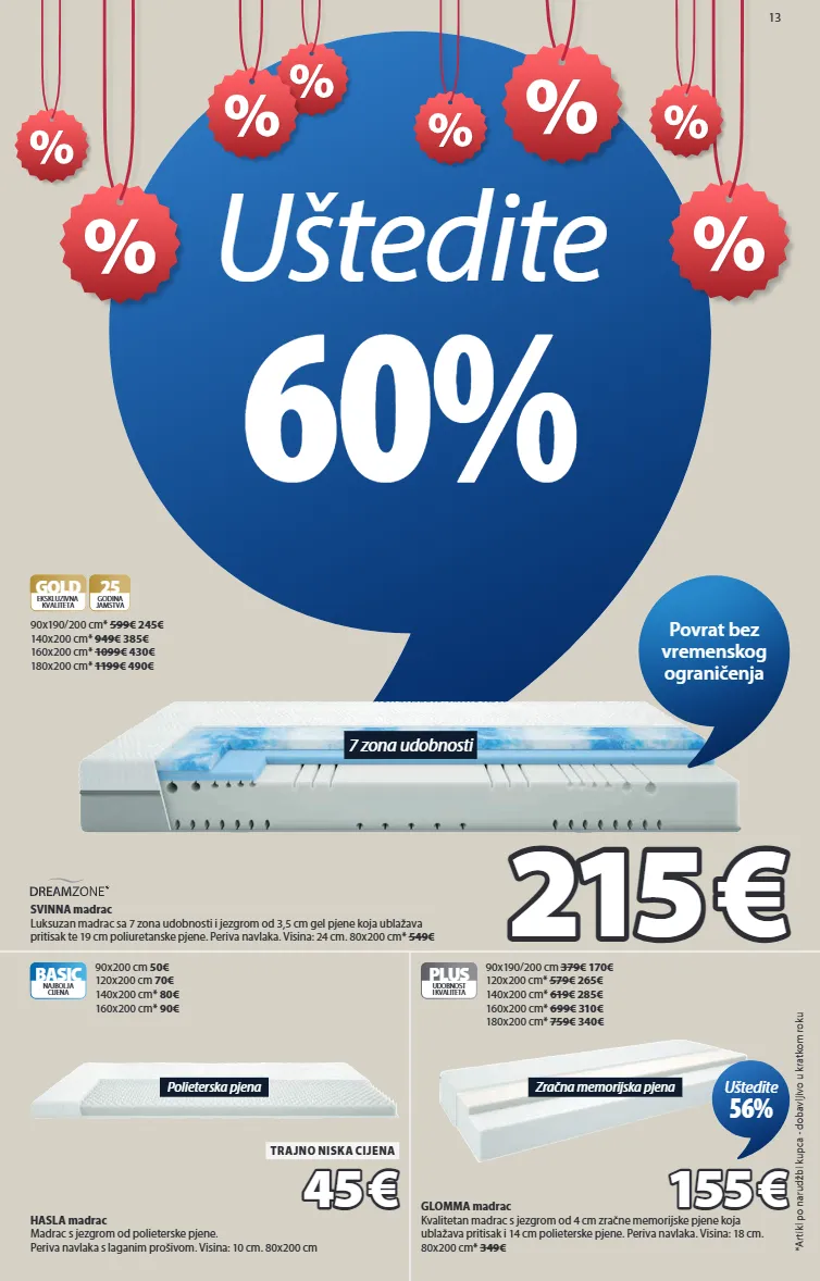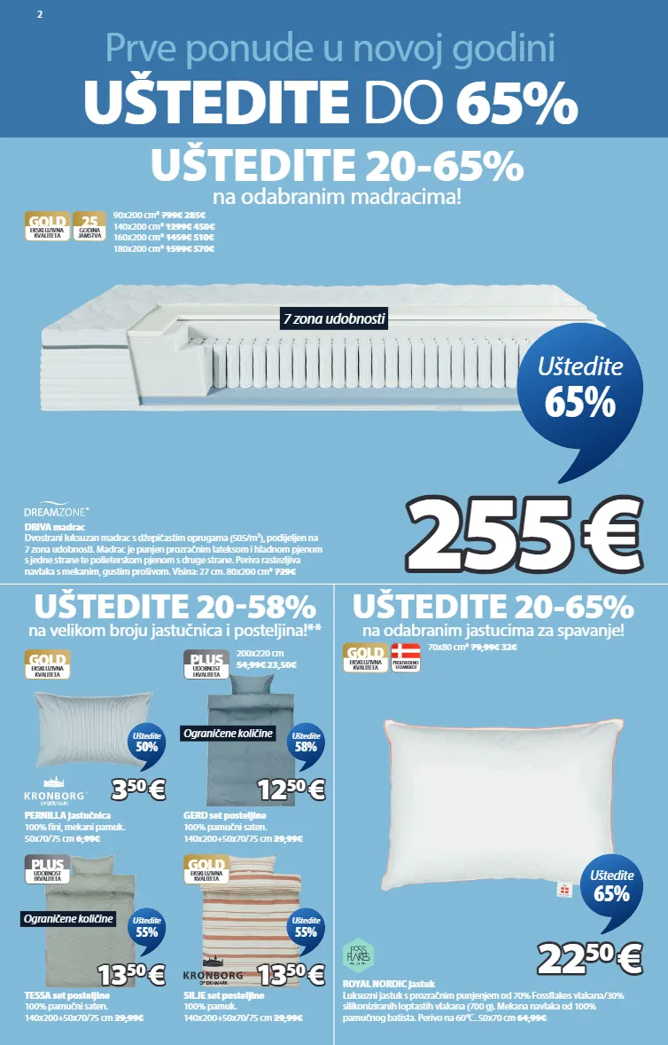 2 prve ponude u novoj godini uštedite do 65% uštedite 20-65% na odabranim madracima! 7 zona udobnosti driva madrac dvostrani luksuzan madrac s džepičastim oprugama (505/m²), podijeljen na 7 zona udobnosti. madrac je punjen prozračnim lateksom i hladnom pjenom s jedne strane te polieterskom pjenom s druge strane. periva rastezljiva navlaka s mekanim, gustim prošivom. visina: 27 cm. 80x200 cm* 729€ gold 25 godina jamstva ekskluzivna kvaliteta 90x200 cm* 799€ 285€ 140x200 cm* 1299€ 450€ 160x200 cm* 1459€ 510€ 180x200 cm* 1599€ 570€ 255 255 € € uštedite 65% uštedite 20-65% na odabranim jastucima za spavanje! uštedite 20-58% na velikom broju jastučnica i posteljina!** royal nordic jastuk luksuzni jastuk s prozračnim punjenjem od 70% fossflakes vlakana/30% silikoniziranih loptastih vlakana (700 g). mekana navlaka od 100% pamučnog batista. perivo na 60°c. 50x70 cm 64,99€ gold ekskluzivna kvaliteta proizvedeno u danskoj 70x80 cm* 79,99€ 32€ 22 22 50 50 € € uštedite 65% gold ekskluzivna kvaliteta pernilla jastučnica 100% fini, mekani pamuk. 50x70/75 cm 6,99€ 3 3 50 50 € € uštedite 50% ograničene količine plus udobnost i kvaliteta tessa set posteljine 100% pamučni saten. 140x200+50x70/75 cm 29,99€ 13 13 50 50 € € uštedite 55% ograničene količine gerd set posteljine 100% pamučni saten. 140x200+50x70/75 cm 29,99€ plus udobnost i kvaliteta 200x220 cm 54,99€ 23,50€ 12 12 50 50 € € uštedite 58% gold ekskluzivna kvaliteta silje set posteljine 100% pamuk. 140x200+50x70/75 cm 29,99€ 13 13 50 50 € € uštedite 55% 3397523 4316904 7386380 1065442 1829080 7388880
