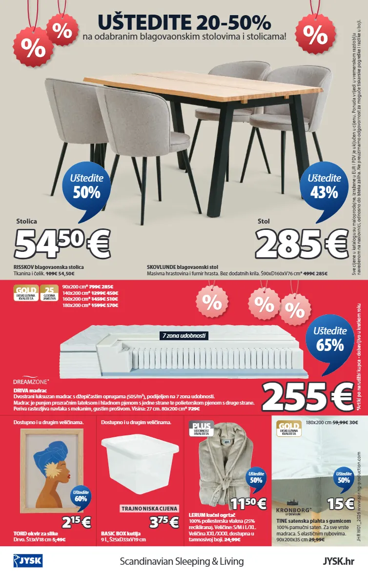scandinavian sleeping & living jysk.hr skovlunde blagovaonski stol masivna hrastovina i furnir hrasta. bez dodatnih krila. š90xd160xv76 cm* 499€ 285€ uštedite 20-50% na odabranim blagovaonskim stolovima i stolicama! 285 285 € € stol uštedite 43% risskov blagovaonska stolica tkanina i čelik. 109€ 54,50€ 54 54 50 50 € € stolica uštedite 50% 7 zona udobnosti gold 25 godina jamstva ekskluzivna kvaliteta driva madrac dvostrani luksuzan madrac s džepičastim oprugama (505/m²), podijeljen na 7 zona udobnosti. madrac je punjen prozračnim lateksom i hladnom pjenom s jedne strane te polieterskom pjenom s druge strane. periva rastezljiva navlaka s mekanim, gustim prošivom. visina: 27 cm. 80x200 cm* 729€ 90x200 cm* 799€ 285€ 140x200 cm* 1299€ 450€ 160x200 cm* 1459€ 510€ 180x200 cm* 1599€ 570€ 255 255 € € uštedite 65% tord okvir za slike drvo. š13xv18 cm 5,49€ dostupno i u drugim veličinama. 2 2 15 15 € € uštedite 60% basic box kutija 9 l, š25xd33xv19 cm dostupno i u drugim veličinama. 3 3 75 75 € € trajno niska cijena lerum kućni ogrtač 100% poliesterska vlakna (25% reciklirana). veličine: s/m i l/xl. veličina xxl/xxxl dostupna u tamnosivoj boji. 24,99€ 11 11 50 50 € € uštedite 50% gold ekskluzivna kvaliteta tine satenska plahta s gumicom 100% pamučni saten. za sve vrste madraca. s elastičnim rubovima. 90x200x35 cm 29,99€ 180x200 cm 59,99€ 30€ 15 15 € € uštedite 50% sve cijene u katalogu su maloprodajne, izražene u eur i pdv je uključen u cijenu. ponuda vrijedi u vremenskom razdoblju navedenom na naslovnici, odnosno do isteka zaliha. ne preuzimamo odgovornost za moguće tiskarske pogreške i razlike u boji. *artikl po narudžbi kupca - dobavljivo u kratkom roku jhr w01_2026 www.spring-production.com plus udobnost i kvaliteta 3601232 3601227 3397523 4912554 4922008 2817003 1425001