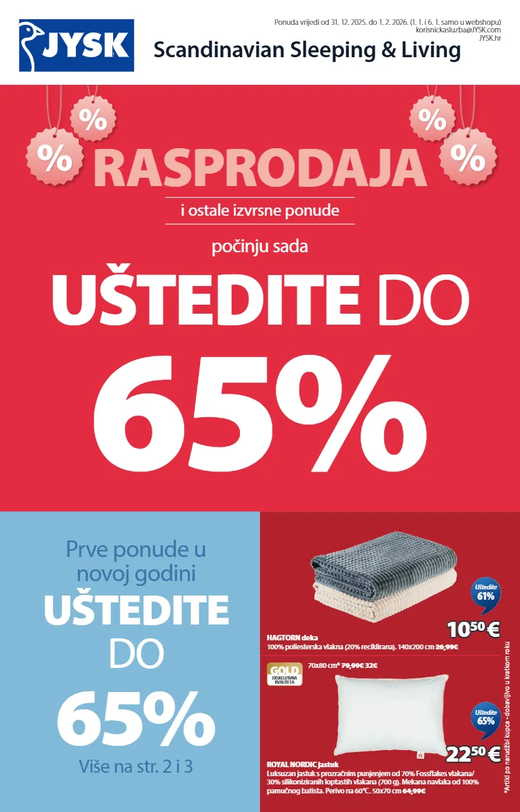 scandinavian sleeping & living ponuda vrijedi od 31. 12. 2025. do 1. 2. 2026. (1. 1. i 6. 1. samo u webshopu) korisnickasluzba@jysk.com jysk.hr i ostale izvrsne ponude rasprodaja uštedite do 65% počinju sada hagtorn deka 100% poliesterska vlakna (20% reciklirana). 140x200 cm 26,99€ 10 10 50 50 € € uštedite 61% gold ekskluzivna kvaliteta royal nordic jastuk luksuzan jastuk s prozračnim punjenjem od 70% fossflakes vlakana/ 30% silikoniziranih loptastih vlakana (700 g). mekana navlaka od 100% pamučnog batista. perivo na 60°c. 50x70 cm 64,99€ 70x80 cm* 79,99€ 32€ 22 22 50 50 € € uštedite 65% prve ponude u novoj godini uštedite do 65% više na str. 2 i 3 *artikl po narudžbi kupca - dobavljivo u kratkom roku 4533607 4316904