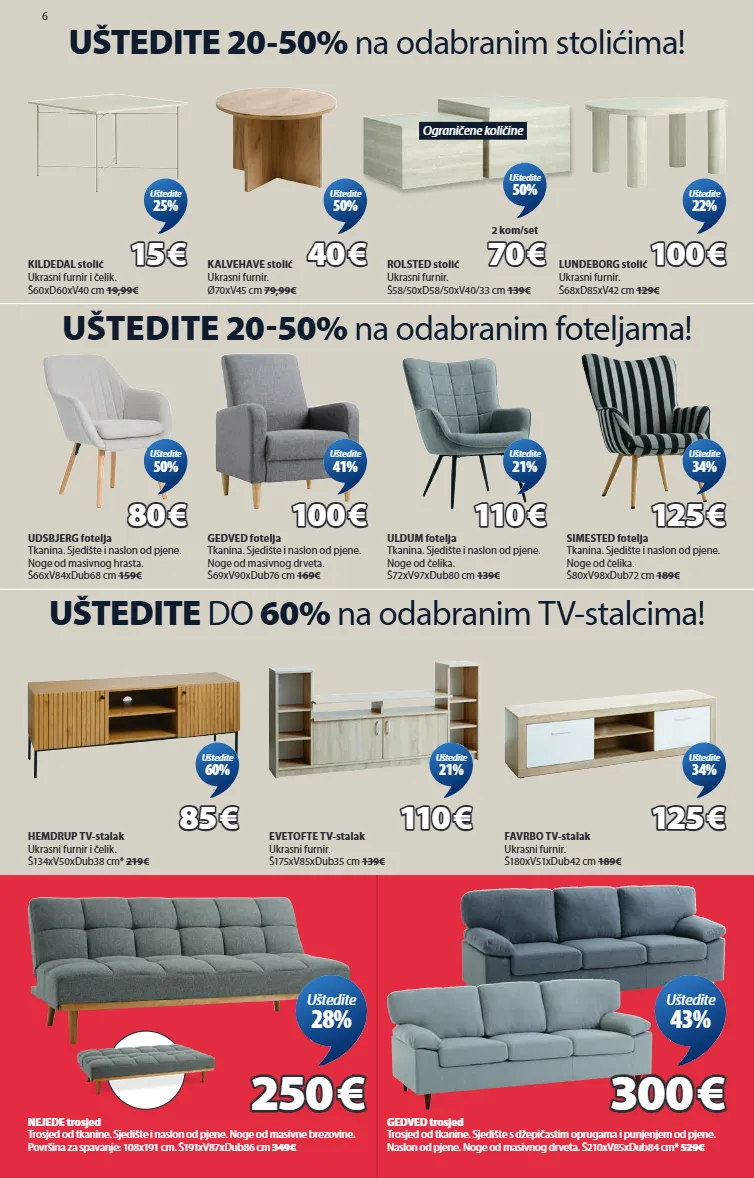 6 uštedite 20-50% na odabranim stolićima! kildedal stolić ukrasni furnir i čelik. š60xd60xv40 cm 19,99€ 15 15 € € uštedite 25% kalvehave stolić ukrasni furnir. ø70xv45 cm 79,99€ 40 40 € € uštedite 50% rolsted stolić ukrasni furnir. š58/50xd58/50xv40/33 cm 139€ 70 70 € € 2 kom/set uštedite 50% uštedite 20-50% na odabranim foteljama! udsbjerg fotelja tkanina. sjedište i naslon od pjene. noge od masivnog hrasta. š66xv84xdub68 cm 159€ 80 80 € € uštedite 50% gedved fotelja tkanina. sjedište i naslon od pjene. noge od masivnog drveta. š69xv90xdub76 cm 169€ 100 100 € € uštedite 41% uldum fotelja tkanina. sjedište i naslon od pjene. noge od čelika. š72xv97xdub80 cm 139€ 110 110 € € uštedite 21% simested fotelja tkanina. sjedište i naslon od pjene. noge od čelika. š80xv98xdub72 cm 189€ 125 125 € € uštedite 34% uštedite do 60% na odabranim tv-stalcima! hemdrup tv-stalak ukrasni furnir i čelik. š134xv50xdub38 cm* 219€ 85 85 € € uštedite 60% evetofte tv-stalak ukrasni furnir. š175xv85xdub35 cm 139€ 110 110 € € uštedite 21% favrbo tv-stalak ukrasni furnir. š180xv51xdub42 cm 189€ 125 125 € € uštedite 34% nejede trosjed trosjed od tkanine. sjedište i naslon od pjene. noge od masivne brezovine. površina za spavanje: 108x191 cm. š191xv87xdub86 cm 349€ 250 250 € € uštedite 28% gedved trosjed trosjed od tkanine. sjedište s džepičastim oprugama i punjenjem od pjene. naslon od pjene. noge od masivnog drveta. š210xv85xdub84 cm* 529€ 300 300 € € uštedite 43% ograničene količine lundeborg stolić ukrasni furnir. š68xd85xv42 cm 129€ 100 100 € € uštedite 22% 3650031 3620203 3650087 3650085 3690331 3640377 3670006 3670024 3696642 3668173 3601127 3600396 3600407 3650100