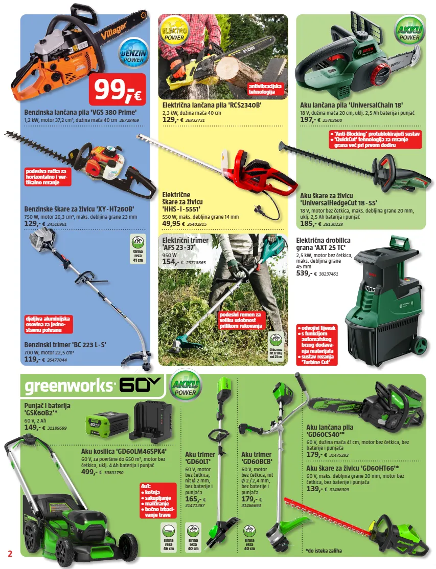 2 podesiva ručka za horizontalno i ver- tikalno rezanje djeljiva aluminijska osovina za jedno- stavnu pohranu antivibracijska tehnologija • 'anti-blocking' protublokirajući sustav • 'quickcut' tehnologija za rezanje grana već pri prvom dodiru • odvojivi lijevak • s funkcijom automatskog brzog dodava- nja materijala • sustav rezanja 'turbine cut' širina reza nit 37 cm / nož 23 cm širina reza 41 cm podesivi remen za veliku udobnost prilikom rukovanja 4u1: • košnja • sakupljanje • malčiranje • bočno izbaci- vanje trave širina reza 40 cm širina reza 40 cm širina reza 46 cm benzinska lančana pila 'vgs 380 prime' 1,2 kw, motor 37,2 cm³, dužina mača 40 cm 26728469 benzinski trimer 'bc 223 l - s' 700 w, motor 22,5 cm³ 119,- € 26477044 aku trimer 'gd60bcb' 60 v, motor bez četkica, nit ø 2 / 2,4 mm, bez baterije i punjača 179,- € 31466693 aku trimer 'gd60lt' 60 v, motor bez četkica, nit ø 2 mm, bez baterije i punjača 165,- € 31471387 električna lančana pila 'rcs2340b' 2,3 kw, dužina mača 40 cm 129,- € 26832731 aku kosilica 'gd60lm46spk4' 60 v, za površine do 650 m2, motor bez četkica, uklj. 4 ah baterija i punjač 499,- € 30801750 punjač i baterija 'gsk60b2'* 60 v, 2 ah 149,- € 31189699 aku škare za živicu 'gd60ht66'* 60 v, maks. debljina grane 20 mm, motor bez četkica, bez baterije i punjača 139,- € 31486309 aku lančana pila 'gd60cs40'* 60 v, dužina mača 41 cm, motor bez četkica, bez baterije i punjača 179,- € 31475282 električna drobilica grana 'axt 25 tc' 2,5 kw, motor bez četkica, maks. debljina grane 45 mm 539,- € 30237461 aku škare za živicu 'universalhedgecut 18 - 55' 18 v, motor bez četkica, maks. debljina grane 20 mm, uklj. 2,5 ah baterija i punjač 185,- € 28130228 električne škare za živicu 'hhs - i - 5551' 550 w, maks. debljina grane 14 mm 49,95 € 26402815 benzinske škare za živicu 'xy - ht260b' 750 w, motor 26,3 cm³, maks. debljina grane 23 mm 129,- € 24510961 aku lančana pila 'universalchain 18' 18 v, dužina mača 20 cm, uklj. 2,5 ah baterija i punjač 197,- € 25702600 99, - € *do isteka zaliha električni trimer 'afs 23 - 37' 950 w 154,- € 23718665