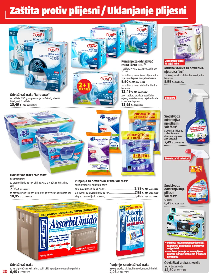 20 Djeluje za 10 minuta! 2u1: protiv vlage & svjež miris • održivo: može se ponovo koristiti, uz pomoć 'pražnjenja' u mikroval- noj pećnici • savršeno rješenje za zamagljene prozore i druge probleme s vlagom u vozilima bez klora Zaštita protiv plijesni / Uklanjanje plijesni Punjenje za odvlaživač zraka 450 g, vrećica s kristalima soli, neutralni miris 2,95 € 27227039 Punjenje za odvlaživač zraka 'Aero 360°' 1 tableta = 450 g, za prostorije do 20 m2 2 x tableta, s eteričnim uljem, miris svježine slapova ili cvjetne livade 9,50 € npr. 28245016 2 x tableta, neutralni miris ili miris lavande 12,49 € npr. 22336602 2 + 1 tableta gratis, s eteričnim uljem, miris lavande, cvjetne livade i svježine slapova 13,95 € 28256133 Punjenje za odvlaživač zraka 'Air Max' miris lavande ili neutralni miris 450 g, za prostorije do 45 m³ 3,89 € npr. 27163151 3 x 450 g, za prostorije do 45 m³ 7,95 € npr. 24914800 1 kg, za prostorije do 100 m³ 5,49 € npr. 21173851 Sredstvo za odstranjivanje plijesni 'Air Max' 500 ml 6,49 € 22167194 Sredstvo za odstranjiva- nje plijesni 'Air Max' 500 ml, prikladno za korištenje u dnevnim i spava- ćim sobama 7,49 € 23809523 Odvlaživač zraka za vozila 100 % bez curenja 12,89 € 28951322 Odvlaživač zraka 'Air Max' neutralni miris za prostorije do 45 m³, uklj. 1 x 450 g vrećica s kristalima soli 7,95 € 27165713 za prostorije do 100 m ³ , uklj. 1 x 1 kg vrećica s kristalima soli 10,95 € 27136454 Mirisne vrećice za odvlaživa- nje zraka '2u1' 2 x 50 g, vrećica s kristalima soli, miris lavande 5,99 € 20906382 Odvlaživač zraka 'Aero 360°' za tablete 450 g, za prostorije do 20 m 2 , plavi ili bijeli, uklj. 1 tableta 13,49 € npr. 22588971 Odvlaživač zraka za 450 g vrećicu s kristalima soli, uklj. 1 punjenje neutralnog mirisa 6,45 € 27229327