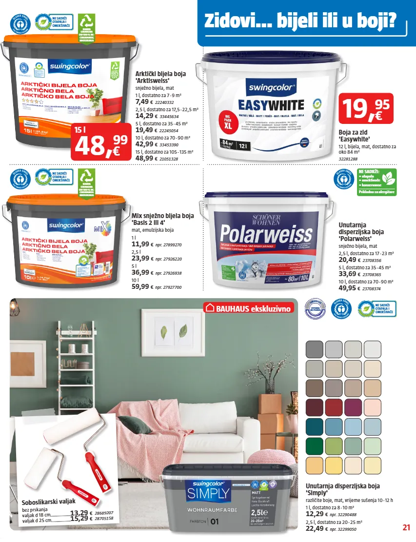 21 ne sadrži otapala i omekšivače s m a n j u j e otporna na pisanje t r a g o v e o g r e b o t i n a i h a b a n j e ne sadrži: • otapala • omekšivače • konzervanse prikladno za alergičare bauhaus ekskluzivno ne sadrži otapala i omekšivače kanta izrađena od 100 % re- cikliranog materijala kanta izrađena od 100 % re- cikliranog materijala ne sadrži otapala i omekšivače zidovi... bijeli ili u boji? soboslikarski valjak bez prskanja valjak d 18 cm 13,29 € 28689207 valjak d 25 cm 15,29 € 28705158 mix snježno bijela boja 'basis 2 ili 4' mat, emulzijska boja 1 l 11,99 € npr. 27899270 2,5 l 23,99 € npr. 27926220 5 l 36,99 € npr. 27926938 10 l 59,99 € npr. 27927700 arktički bijela boja 'arktisweiss' snježno bijela, mat 1 l, dostatno za 7 - 9 m 2 7,49 € 22240332 2,5 l, dostatno za 17,5 - 22,5 m 2 14,29 € 33445634 5 l, dostatno za 35 - 45 m 2 19,49 € 22245054 10 l, dostatno za 70 - 90 m 2 42,99 € 33453390 15 l, dostatno za 105 - 135 m 2 48,99 € 21051328 boja za zid 'easywhite' 12 l, bijela, mat, dostatno za oko 84 m 2 32281288 unutarnja disperzijska boja 'polarweiss' snježno bijela, mat 2,5 l, dostatno za 17 - 23 m 2 20,49 € 23708356 5 l, dostatno za 35 - 45 m 2 33,69 € 23708365 10 l, dostatno za 70 - 90 m2 49,95 € 23708374 unutarnja disperzijska boja 'simply' različite boje, mat, vrijeme sušenja 10 - 12 h 1 l, dostatno za 8 - 10 m 2 12,29 € npr. 32290488 2,5 l, dostatno za 20 - 25 m 2 22,49 € npr. 32299050 19 , € 95 15 l 48, € 99