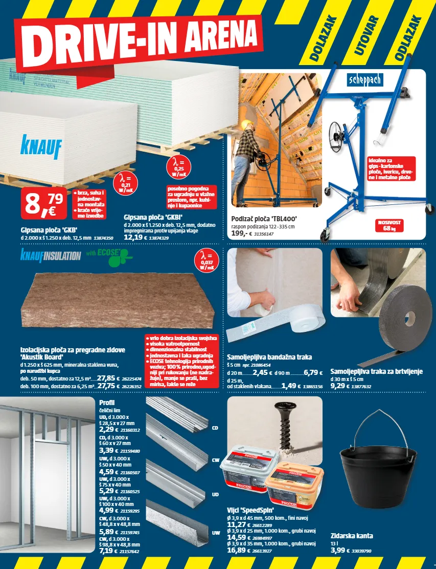 CD CW UD UW 0,037 W / mK = DOLAZAK UTOVAR ODLAZAK • vrlo dobra izolacijska svojstva • visoka vatrootpornost • dimenzionalna stabilnost • jednostavna i laka ugradnja • ECOSE tehnologija prirodnih veziva; 100 % prirodno,ugod- niji pri rukovanju (ne nadra- žuje), manje se praši, bez mirisa, lakše se reže • brza, suha i jednostav- na montaža • kraće vrije- me izvedbe posebno pogodna za ugradnju u vlažne prostore, npr. kuhi- nje i kupaonice NOSIVOST 68 kg idealno za gips - kartonske ploče, ivericu, drve- ne i metalne ploče 0,25 W / mK = 0,21 W / mK = Profil čelični lim UD, d 3.000 x š 28,5 x v 27 mm 2,29 € 21160312 CD, d 3.000 x š 60 x v 27 mm 3,39 € 21159480 UW, d 3.000 x š 50 x v 40 mm 4,59 € 21160507 UW, d 3.000 x š 75 x v 40 mm 5,29 € 21160525 UW, d 3.000 x š 100 x v 40 mm 4,99 € 21159295 CW, d 3.000 x š 48,8 x v 48,8 mm 5,89 € 21159745 CW, d 3.000 x š 98,8 x v 48,8 mm 7,19 € 21157642 Izolacijska ploča za pregradne zidove 'Akustik Board' d 1.250 x š 625 mm, mineralna staklena vuna, po narudžbi kupca deb. 50 mm, dostatno za 12,5 m² 27,85 € 26225474 deb. 100 mm, dostatno za 6,25 m² 27,75 € 26226352 Gipsana ploča 'GKB' d 2.000 x š 1.250 x deb. 12,5 mm 13874350 Gipsana ploča 'GKBI' d 2.000 x š 1.250 x deb. 12,5 mm, dodatno impregnirana protiv upijanja vlage 12,19 € 13874329 8 , € 79 Vijci 'SpeedSpin' Ø 3,9 x d 45 mm, 500 kom., fini navoj 11,27 € 26612289 Ø 3,9 x d 25 mm, 1.000 kom., grubi navoj 14,59 € 26984997 Ø 3,9 x d 35 mm, 1.000 kom., grubi navoj 16,89 € 26613927 Samoljepljiva bandažna traka š 5 cm npr. 21086454 d 20 m 2,45 € d 90 m 6,79 € d 25 m, od staklenih vlakana 1,49 € 13865156 Samoljepljiva traka za brtvljenje d 30 m x š 5 cm 9,29 € 13877632 Podizač ploča 'TBL400' raspon podizanja 122 - 335 cm 199,- € 31356147 Zidarska kanta 13 l 3,99 € 33039790