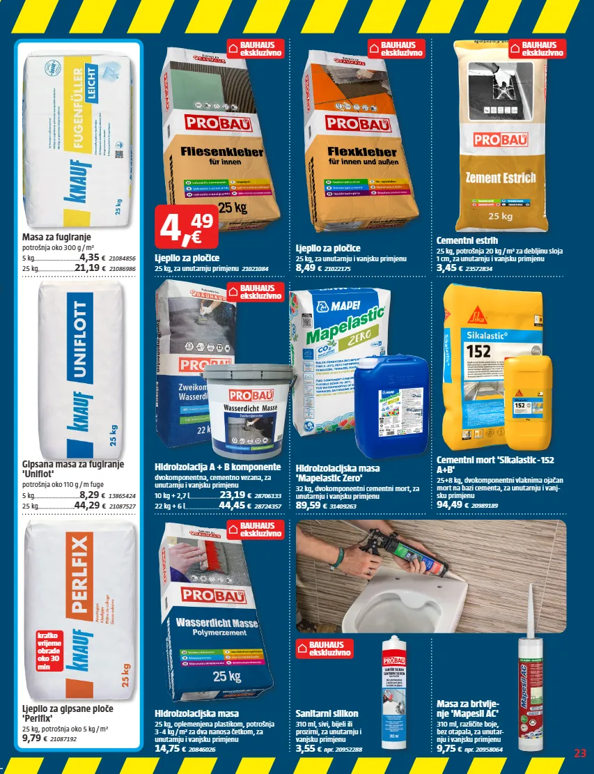 23 bauhaus ekskluzivno bauhaus ekskluzivno bauhaus ekskluzivno bauhaus ekskluzivno bauhaus ekskluzivno bauhaus ekskluzivno kratko vrijeme obrade oko 30 min 4 , € 49 gipsana masa za fugiranje 'uniflot' potrošnja oko 110 g / m fuge 5 kg 8,29 € 13865424 25 kg 44,29 € 21087527 ljepilo za gipsane ploče 'perlfix' 25 kg, potrošnja oko 5 kg / m ² 9,79 € 21087192 masa za fugiranje potrošnja oko 300 g / m² 5 kg 4,35 € 21084856 25 kg 21,19 € 21086986 ljepilo za pločice 25 kg, za unutarnju primjenu 21021084 sanitarni silikon 310 ml, sivi, bijeli ili prozirni, za unutarnju i vanjsku primjenu 3,55 € npr. 20952288 masa za brtvlje- nje 'mapesil ac' 310 ml, različite boje, bez otapala, za unutar- nju i vanjsku primjenu 9,75 € npr. 20958064 hidroizolacija a + b komponente dvokomponentna, cementno vezana, za unutarnju i vanjsku primjenu 10 kg + 2,7 l 23,19 € 28706133 22 kg + 6 l 44,45 € 28724357 hidroizolacijska masa 'mapelastic zero' 32 kg, dvokomponentni cementni mort, za unutarnju i vanjsku primjenu 89,59 € 31409263 hidroizolacijska masa 25 kg, oplemenjena plastikom, potrošnja 3 - 4 kg / m² za dva nanosa četkom, za unutarnju i vanjsku primjenu 14,75 € 20846026 ljepilo za pločice 25 kg, za unutarnju i vanjsku primjenu 8,49 € 21022175 cementni estrih 25 kg, potrošnja 20 kg / m ² za debljinu sloja 1 cm, za unutarnju i vanjsku primjenu 3,45 € 23572834 cementni mort 'sikalastic - 152 a+b' 25+8 kg, dvokomponentni vlaknima ojačan mort na bazi cementa, za unutarnju i vanj- sku primjenu 94,49 € 20989189