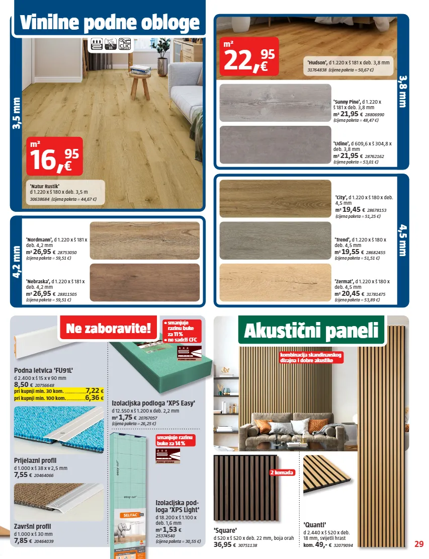 29 3,5 mm 4,5 mm 3,8 mm 4,2 mm • smanjuje razinu buke za 11 % • ne sadrži cfc smanjuje razinu buke za 14 % podno grijanje prikladan za podno grijanje prikladan za ne zaboravite! kombinacija skandinavskog dizajna i dobre akustike 2 komada vinilne podne obloge akustični paneli 'city', d 1.220 x š 180 x deb. 4,5 mm m² 19,45 € 28678153 (cijena paketa = 51,25 €) 'trend', d 1.220 x š 180 x deb. 4,5 mm m² 19,55 € 28682455 (cijena paketa = 51,51 €) 'zermat', d 1.220 x š 180 x deb. 4,5 mm m² 20,45 € 31781475 (cijena paketa = 53,89 €) 'sunny pine', d 1.220 x š 181 x deb. 3,8 mm m² 21,95 € 28806990 (cijena paketa = 48,47 €) 'nebraska', d 1.220 x š 181 x deb. 4,2 mm m² 26,95 € 28811505 (cijena paketa = 59,51 €) 'udine', d 609,6 x š 304,8 x deb. 3,8 mm m² 21,95 € 28762162 (cijena paketa = 53,01 €) 'natur rustik' d 1.220 x š 180 x deb. 3,5 m 30638684 (cijena paketa = 44,67 €) 'nordmann', d 1.220 x š 181 x deb. 4,2 mm m² 26,95 € 28753050 (cijena paketa = 59,51 €) 'hudson', d 1.220 x š 181 x deb. 3,8 mm 31764838 (cijena paketa = 50,67 €) prijelazni profil d 1.000 x š 38 x v 2,5 mm 7,55 € 20464066 izolacijska pod- loga 'xps light' d 18.200 x š 1.100 x deb. 1,6 mm m² 1,53 € 25374540 (cijena paketa = 30,55 €) izolacijska podloga 'xps easy' d 12.550 x š 1.200 x deb. 2,2 mm m² 1,75 € 20767057 (cijena paketa = 26,25 €) 'square' d 520 x š 520 x deb. 22 mm, boja orah 36,95 € 30751138 'quanti' d 2.440 x š 520 x deb. 18 mm, svijetli hrast kom. 49,- € 32079094 završni profil d 1.000 x š 30 mm 7,85 € 20464039 podna letvica 'fu91l' d 2.400 x š 15 x v 90 mm 8,50 € 20756648 pri kupnji min. 30 kom. 7,22 € pri kupnji min. 100 kom. 6,36 € m² 16, € 95 m² 22, € 95