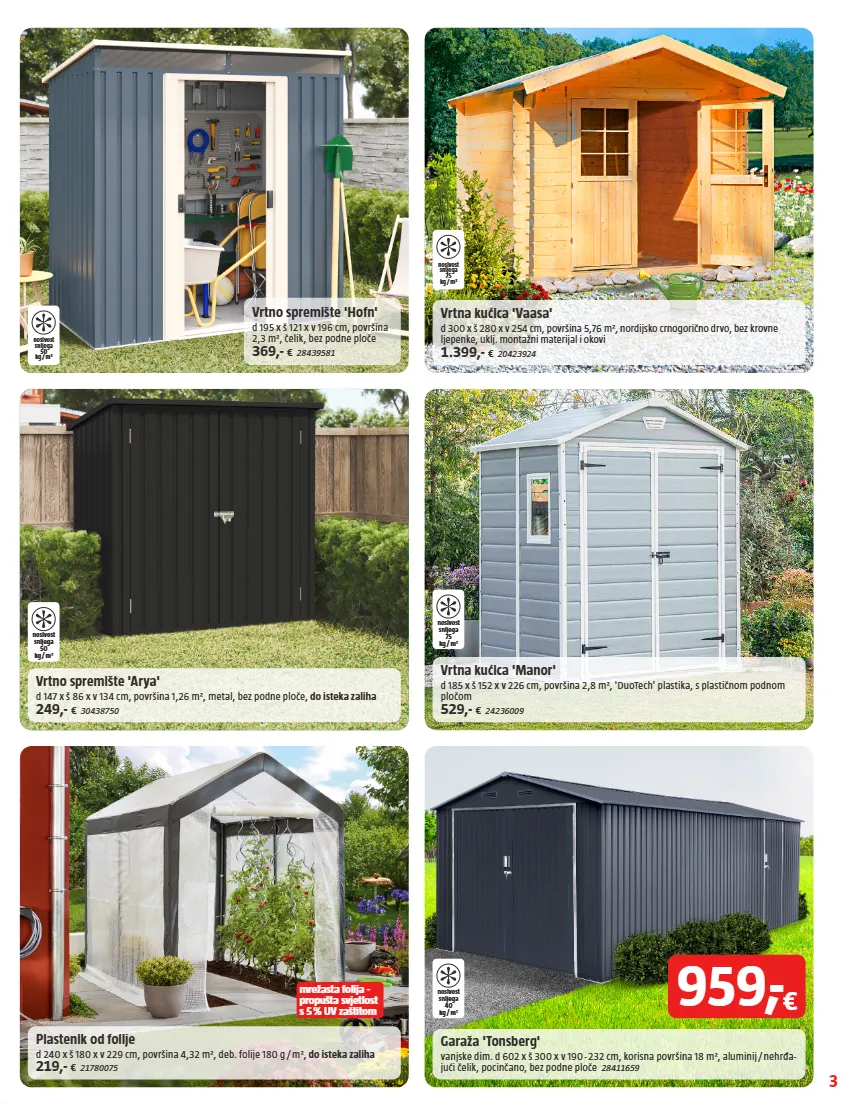 3 mrežasta folija - propušta svjetlost s 5 % UV zaštitom nosivost snijega 50 kg / m² nosivost snijega 50 kg / m² nosivost snijega 75 kg / m² nosivost snijega 40 kg / m² nosivost snijega 75 kg / m² Garaža 'Tonsberg' vanjske dim. d 602 x š 300 x v 190 - 232 cm, korisna površina 18 m 2 , aluminij / nehrđa- jući čelik, pocinčano, bez podne ploče 28411659 Plastenik od folije d 240 x š 180 x v 229 cm, površina 4,32 m 2 , deb. folije 180 g / m 2 , do isteka zaliha 219,- € 21780075 Vrtna kućica 'Vaasa' d 300 x š 280 x v 254 cm, površina 5,76 m2, nordijsko crnogorično drvo, bez krovne ljepenke, uklj. montažni materijal i okovi 1.399,- € 20423924 Vrtna kućica 'Manor' d 185 x š 152 x v 226 cm, površina 2,8 m2, 'DuoTech' plastika, s plastičnom podnom pločom 529,- € 24236009 Vrtno spremište 'Arya' d 147 x š 86 x v 134 cm, površina 1,26 m2, metal, bez podne ploče, do isteka zaliha 249,- € 30438750 Vrtno spremište 'Hofn' d 195 x š 121 x v 196 cm, površina 2,3 m2, čelik, bez podne ploče 369,- € 28439581 959, - €