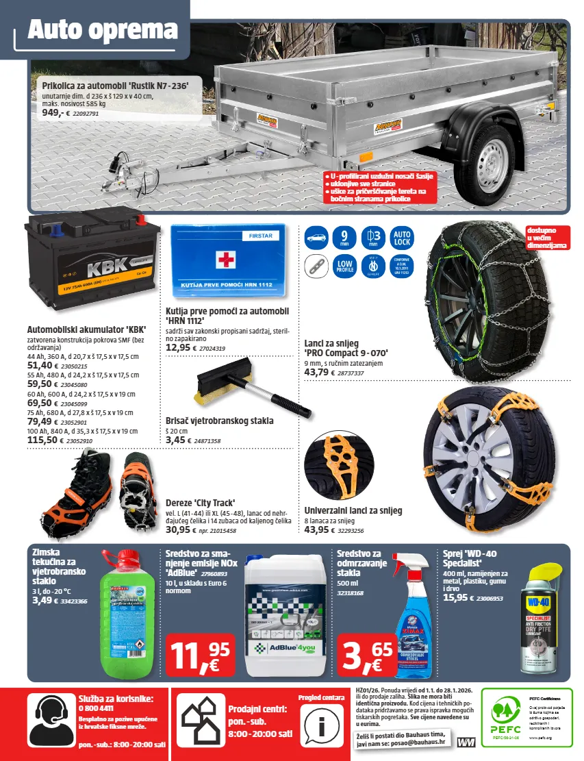 služba za korisnike: 0 800 4411 besplatno za pozive upućene iz hrvatske fiksne mreže. pregled centara želiš li postati dio bauhaus tima, javi nam se: posao@bauhaus.hr prodajni centri: pon. - sub. 8:00 - 20:00 sati pon. - sub.: 8:00 - 20:00 sati pefc/56-31-06 pefc certificirano ovaj proizvod potje č e iz šuma kojima se održivo gospodari, recikliranih i kontroliranih izvora www.pefc.org i hz01/26. ponuda vrijedi od 1. 1. do 28. 1. 2026. ili do prodaje zaliha. slika ne mora biti identična proizvodu. kod cijena i tehničkih po- dataka pridržavamo se prava ispravka mogućih tiskarskih pogrešaka. sve cijene navedene su u eurima. auto oprema dostupno u većim dimenzijama • u - profilirani uzdužni nosači šasije • uklonjive sve stranice • ušice za pričvršćivanje tereta na bočnim stranama prikolice univerzalni lanci za snijeg 8 lanaca za snijeg 43,95 € 32293256 sprej 'wd - 40 specialist' 400 ml, namijenjen za metal, plastiku, gumu i drvo 15,95 € 23006953 brisač vjetrobranskog stakla š 20 cm 3,45 € 24871358 sredstvo za odmrzavanje stakla 500 ml 32318168 dereze 'city track' vel. l (41 - 44) ili xl (45 - 48), lanac od nehr- đajućeg čelika i 14 zubaca od kaljenog čelika 30,95 € npr. 21015458 kutija prve pomoći za automobil 'hrn 1112' sadrži sav zakonski propisani sadržaj, steril- no zapakirano 12,95 € 27024319 sredstvo za sma- njenje emisije nox 'adblue' 27960893 10 l, u skladu s euro 6 normom automobilski akumulator 'kbk' zatvorena konstrukcija pokrova smf (bez održavanja) 44 ah, 360 a, d 20,7 x š 17,5 x v 17,5 cm 51,40 € 23050215 55 ah, 480 a, d 24,2 x š 17,5 x v 17,5 cm 59,50 € 23045080 60 ah, 600 a, d 24,2 x š 17,5 x v 19 cm 69,50 € 23045099 75 ah, 680 a, d 27,8 x š 17,5 x v 19 cm 79,49 € 23052901 100 ah, 840 a, d 35,3 x š 17,5 x v 19 cm 115,50 € 23052910 zimska tekućina za vjetrobransko staklo 3 l, do - 20 °c 3,49 € 33423366 prikolica za automobil 'rustik n7 - 236' unutarnje dim. d 236 x š 129 x v 40 cm, maks. nosivost 585 kg 949,- € 22092791 lanci za snijeg 'pro compact 9 - 070' 9 mm, s ručnim zatezanjem 43,79 € 28737337 11 , € 95 3 , € 65