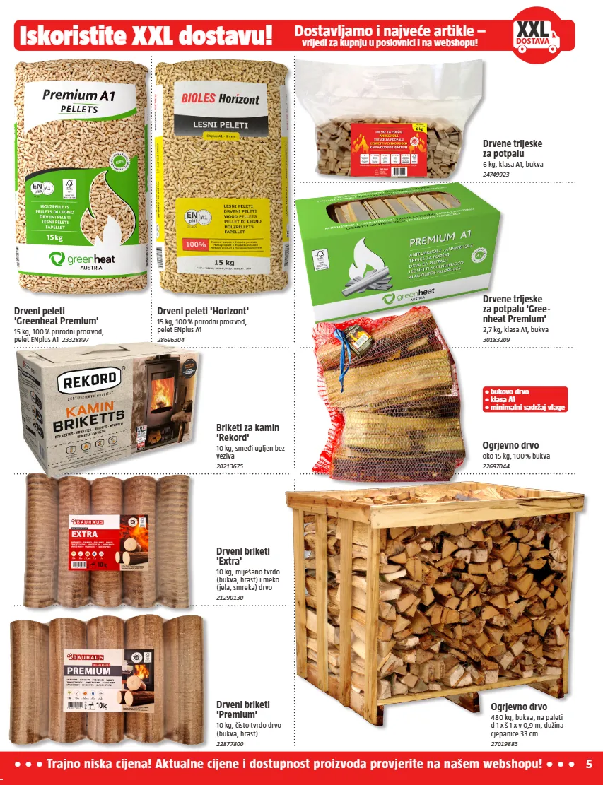 5 xxl dostava iskoristite xxl dostavu! dostavljamo i najveće artikle – vrijedi za kupnju u poslovnici i na webshopu! • bukovo drvo • klasa a1 • minimalni sadržaj vlage • • • trajno niska cijena! aktualne cijene i dostupnost proizvoda provjerite na našem webshopu! • • • drveni peleti 'horizont' 15 kg, 100 % prirodni proizvod, pelet enplus a1 28696304 drveni briketi 'premium' 10 kg, čisto tvrdo drvo (bukva, hrast) 22877800 drvene trijeske za potpalu 6 kg, klasa a1, bukva 24749923 drveni peleti 'greenheat premium' 15 kg, 100 % prirodni proizvod, pelet enplus a1 23328897 briketi za kamin 'rekord' 10 kg, smeđi ugljen bez veziva 20213675 drvene trijeske za potpalu 'gree- nheat premium' 2,7 kg, klasa a1, bukva 30183209 drveni briketi 'extra' 10 kg, miješano tvrdo (bukva, hrast) i meko (jela, smreka) drvo 21290130 ogrjevno drvo oko 15 kg, 100 % bukva 22697044 ogrjevno drvo 480 kg, bukva, na paleti d 1 x š 1 x v 0,9 m, dužina cjepanice 33 cm 27019883