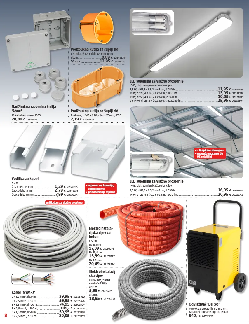 8 prikladan za vlažne prostore • otporno na koroziju, vatrootporno • pričvršćivanje vijcima • s linijskim ožičenjem • moguće spajanje do 95 svjetiljki elektroinstala- cijska cijev za beton d 50 m en 16 mm 17,39 € 21208276 en 13,5 mm 15,39 € 21207097 en 20 mm 20,49 € 21209394 kabel 'nym - j' 3 x 1,5 mm², d 50 m 39,95 € 12185002 3 x 2,5 mm², d 50 m 59,95 € 12185026 3 x 1,5 mm², d 100 m 74,95 € 20029304 3 x 2,5 mm ² , d 100 m 109,- € 22752794 5 x 1,5 mm², d 50 m 59,95 € 12185019 5 x 2,5 mm², d 50 m 89,95 € 12185033 podžbukna kutija za šuplji zid 1 - struka, ø 68 x dub. 45 mm, ip30 1 kom. 0,89 € 12144634 20 kom. 12,95 € 21101782 odvlaživač 'dh 50' 700 w, za prostorije do 160 m², kapacitet odvlaživanja 50 l / dan 549,- € 26531135 led svjetiljka za vlažne prostorije ip65, uklj. zamjenjiva žarulja - cijev 7,5 w, d 67,5 x š 6,2 x v 6 cm, 1.050 lm 11,95 € 31849489 14 w, d 128,4 x š 6,2 x v 6 cm, 1.960 lm 13,95 € 32359538 19 w, d 158,4 x š 6,2 x v 6 cm, 2.660 lm 19,95 € 32111835 2 x 14 w, d 128,4 x š 9,6 x v 6 cm, 3.920 lm 25,95 € 32111844 nadžbukna razvodna kutija 'abox' 14 kabelskih ulaza, ip65 28,89 € 22682031 vodilica za kabel d 2 m š 15 x deb. 15 mm 1,29 € 22845922 š 30 x deb. 15 mm 2,79 € 22844938 š 60 x deb. 40 mm 7,99 € 22835297 elektroinstalacij- ska cijev en 16 mm, tlačna čvrstoća 750 n d 10 m 5,95 € 21775479 d 50 m 18,95 € 21786338 podžbukna kutija za šuplji zid 2 - struka, d 143 x š 70 x dub. 47 mm, ip30 2,19 € 12144672 led svjetiljka za vlažne prostorije ip65, uklj. zamjenjiva žarulja - cijev 7,5 w, d 67,5 x š 6,2 x v 6 cm, 1.050 lm 16,95 € 31849470 14 w, d 128,4 x š 6,2 x v 6 cm, 1.960 lm 26,95 € 32325751