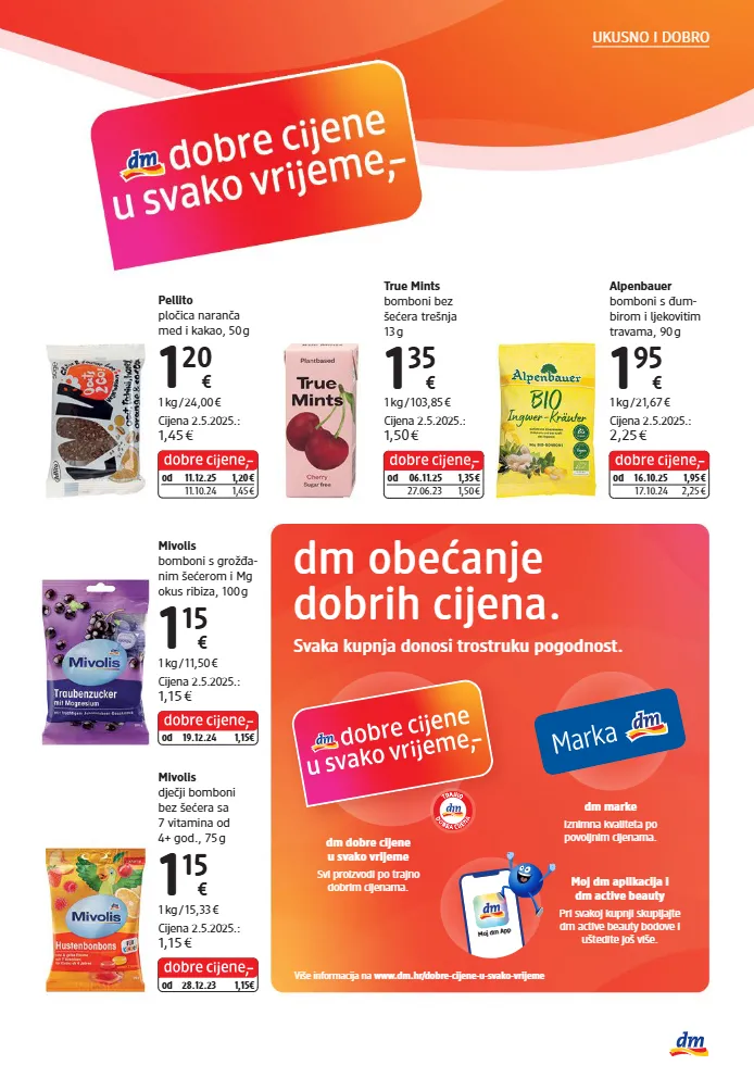 pellito pločica naranča med i kakao, 50 g 1 20 € 1 kg / 24,00 € cijena 2.5.2025.: 1,45 € od 11.12.25 1,20 € 11.10.24 1,45 € true mints bomboni bez šećera trešnja 13 g 1 35 € 1 kg / 103,85 € cijena 2.5.2025.: 1,50 € od 06.11.25 1,35 € 27.06.23 1,50 € mivolis bomboni s grožđa- nim šećerom i mg okus ribiza, 100 g 1 15 € 1 kg / 11,50 € cijena 2.5.2025.: 1,15 € od 19.12.24 1,15€ mivolis dječji bomboni bez šećera sa 7 vitamina od 4+ god., 75 g 1 15 € 1 kg / 15,33 € cijena 2.5.2025.: 1,15 € od 28.12.23 1,15€ alpenbauer bomboni s đum- birom i ljekovitim travama, 90 g 1 95 € 1 kg / 21,67 € cijena 2.5.2025.: 2,25 € od 16.10.25 1,95 € 17.10.24 2,25 € dm obećanje dobrih cijena. svaka kupnja donosi trostruku pogodnost. više informacija na www.dm.hr/dobre-cijene-u-svako-vrijeme dm marke iznimna kvaliteta po povoljnim cijenama. moj dm aplikacija i dm active beauty pri svakoj kupnji skupljajte dm active beauty bodove i uštedite još više. moj dm app dm dobre cijene u svako vrijeme svi proizvodi po trajno dobrim cijenama. ukusno i dobro