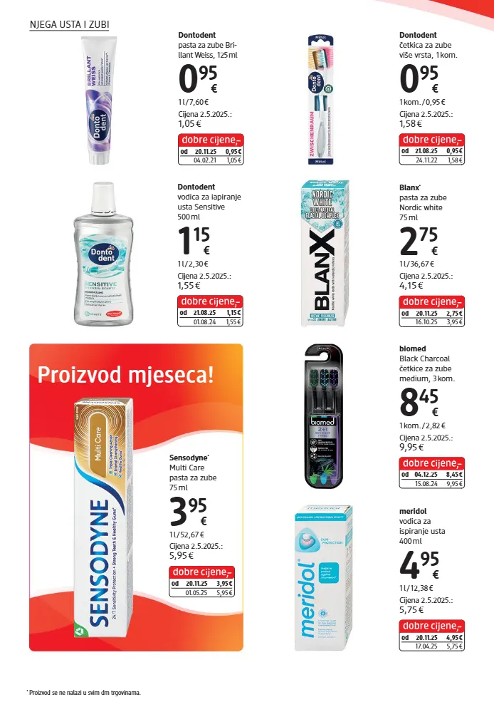 dontodent vodica za iapiranje usta sensitive 500 ml 1 15 € 1 l / 2,30 € cijena 2.5.2025.: 1,55 € od 21.08.25 1,15 € 01.08.24 1,55 € dontodent pasta za zube bri- llant weiss, 125 ml 0 95 € 1 l / 7,60 € cijena 2.5.2025.: 1,05 € od 20.11.25 0,95 € 04.02.21 1,05 € dontodent četkica za zube više vrsta, 1 kom. 0 95 € 1 kom. / 0,95 € cijena 2.5.2025.: 1,58 € od 21.08.25 0,95 € 24.11.22 1,58 € meridol vodica za ispiranje usta 400 ml 4 95 € 1 l / 12,38 € cijena 2.5.2025.: 5,75 € od 20.11.25 4,95 € 17.04.25 5,75 € sensodyne * multi care pasta za zube 75 ml 3 95 € 1 l / 52,67 € cijena 2.5.2025.: 5,95 € od 20.11.25 3,95 € 01.05.25 5,95 € biomed black charcoal četkice za zube medium, 3 kom. 8 45 € 1 kom. / 2,82 € cijena 2.5.2025.: 9,95 € od 04.12.25 8,45 € 15.08.24 9,95 € blanx * pasta za zube nordic white 75 ml 2 75 € 1 l / 36,67 € cijena 2.5.2025.: 4,15 € od 20.11.25 2,75 € 16.10.25 3,95 € * proizvod se ne nalazi u svim dm trgovinama. proizvod mjeseca! njega usta i zubi