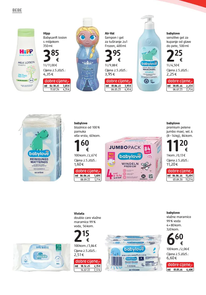 hipp babysanft losion s mlijekom 350 ml 3 85 € 1 l / 11,00 € cijena 2.5.2025.: 4,35 € od 02.10.25 3,85 € 11.07.24 4,35 € babylove blazinice od 100 % pamuka više vrsta, 60 kom. 1 60 € 100 kom. / 2,67 € cijena 2.5.2025.: 1,60 € od 06.06.24 1,60 € 08.09.22 1,71 € babylove premium pelene jumbo maxi, vel. 4 (8 – 14 kg), 84 kom. 11 20 € 1 kom. / 0,13 € cijena 2.5.2025.: 11,20 € od 06.06.24 11,20 € 03.09.20 11,27 € babylove vlažne maramice 99 % voda 4 × 80 kom. 320 kom. 6 60 € 100 kom. / 2,06 € cijena 2.5.2025.: 6,60 € od 01.01.26 6,60€ violeta double care vlažne maramice 99 % voda, 56 kom. 2 15 € 100 kom. / 3,84 € cijena 2.5.2025.: 2,51 € od 18.12.25 2,15 € 14.07.22 2,51 € air-val šampon i gel za tuširanje 2u1 frozen, 400 ml 3 95 € 1 l / 9,88 € cijena 2.5.2025.: 3,95 € od 01.06.23 3,95 € 04.05.23 4,95 € babylove sensitive gel za kupanje od glave do pete, 500 ml 2 25 € 1 l / 4,50 € cijena 2.5.2025.: 2,25 € od 30.05.24 2,25 € 06.07.23 2,75 € bebe