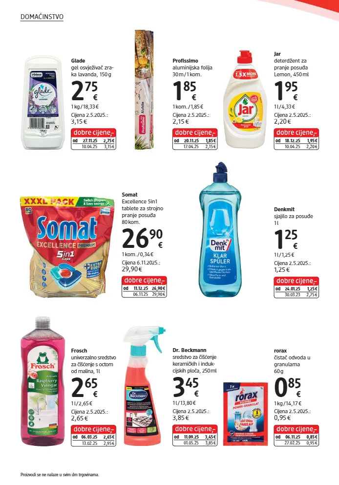 dr. beckmann sredstvo za čišćenje keramičkih i induk- cijskih ploča, 250 ml 3 45 € 1 l / 13,80 € cijena 2.5.2025.: 3,85 € od 11.09.25 3,45 € 01.05.25 3,85 € glade gel osvježivač zra- ka lavanda, 150 g 2 75 € 1 kg / 18,33 € cijena 2.5.2025.: 3,15 € od 27.11.25 2,75 € 10.04.25 3,15 € profissimo aluminijska folija 30 m / 1 kom. 1 85 € 1 kom. / 1,85 € cijena 2.5.2025.: 2,15 € od 20.11.25 1,85 € 17.04.25 2,15 € frosch univerzalno sredstvo za čišćenje s octom od malina, 1 l 2 65 € 1 l / 2,65 € cijena 2.5.2025.: 2,65 € od 06.03.25 2,65 € 13.02.25 2,95 € rorax čistač odvoda u granulama 60 g 0 85 € 1 kg / 14,17 € cijena 2.5.2025.: 0,95 € od 06.11.25 0,85 € 27.02.25 0,95 € somat excellence 5in1 tablete za strojno pranje posuđa 80 kom. 26 90 € 1 kom. / 0,34 € cijena 6.11.2025.: 29,90 € od 11.12.25 26,90 € 06.11.25 29,90 € denkmit sjajilo za posuđe 1 l 1 25 € 1 l / 1,25 € cijena 2.5.2025.: 1,25 € od 24.01.25 1,25 € 30.03.23 2,75 € jar deterdžent za pranje posuđa lemon, 450 ml 1 95 € 1 l / 4,33 € cijena 2.5.2025.: 2,20 € od 18.12.25 1,95 € 10.04.25 2,20 € proizvodi se ne nalaze u svim dm trgovinama. domaćinstvo
