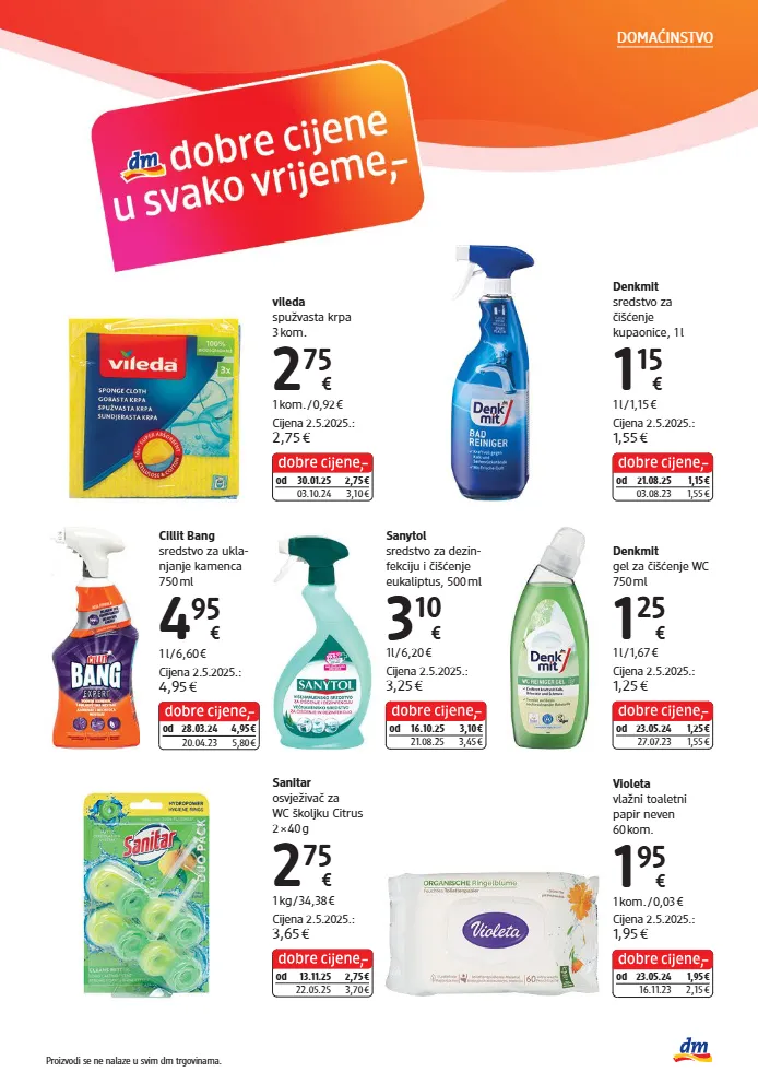 sanitar osvježivač za wc školjku citrus 2 × 40 g 2 75 € 1 kg / 34,38 € cijena 2.5.2025.: 3,65 € od 13.11.25 2,75 € 22.05.25 3,70 € violeta vlažni toaletni papir neven 60 kom. 1 95 € 1 kom. / 0,03 € cijena 2.5.2025.: 1,95 € od 23.05.24 1,95 € 16.11.23 2,15 € cillit bang sredstvo za ukla- njanje kamenca 750 ml 4 95 € 1 l / 6,60 € cijena 2.5.2025.: 4,95 € od 28.03.24 4,95 € 20.04.23 5,80 € sanytol sredstvo za dezin- fekciju i čišćenje eukaliptus, 500 ml 3 10 € 1l / 6,20 € cijena 2.5.2025.: 3,25 € od 16.10.25 3,10 € 21.08.25 3,45 € denkmit sredstvo za čišćenje kupaonice, 1 l 1 15 € 1 l / 1,15 € cijena 2.5.2025.: 1,55 € od 21.08.25 1,15 € 03.08.23 1,55 € vileda spužvasta krpa 3 kom. 2 75 € 1 kom. / 0,92 € cijena 2.5.2025.: 2,75 € od 30.01.25 2,75 € 03.10.24 3,10 € denkmit gel za čišćenje wc 750 ml 1 25 € 1 l / 1,67 € cijena 2.5.2025.: 1,25 € od 23.05.24 1,25 € 27.07.23 1,55 € proizvodi se ne nalaze u svim dm trgovinama. domaćinstvo