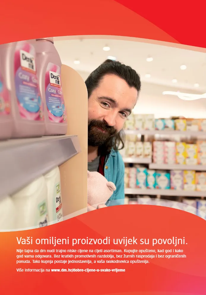 Vaši omiljeni proizvodi uvijek su povoljni. Nije tajna da dm nudi trajno niske cijene na cijeli asortiman. Kupujte opušteno, kad god i kako god vama odgovara. Bez kratkih promotivnih razdoblja, bez žurnih rasprodaja i bez ograničenih ponuda. Tako kupnja postaje jednostavnija, a vaša svakodnevica opuštenija. Više informacija na www.dm.hr/dobre-cijene-u-svako-vrijeme