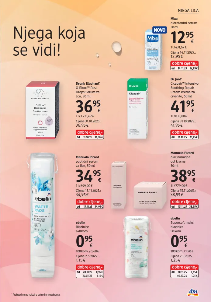 mixa hidratantni serum 30 ml 12 95 € 1 l / 431,67 € cijena 14.11.2025.: 12,95 € od 14.11.25 12,95 € manuela picard peptidni serum za lice, 50 ml 34 95 € 1 l / 699,00 € cijena 15.11.2025.: 34,95 € od 15.11.25 34,95 € manuela picard niacinamidna gel krema 50 ml 38 95 € 1 l / 779,00 € cijena 15.11.2025.: 38,95 € od 15.11.25 38,95 € ebelin supersoft maksi blazinice 50 kom. 0 95 € 100 kom. / 1,90 € cijena 2.5.2025.: 1,25 € od 20.11.25 0,95 € 05.12.24 1,25 € ebelin blazinice 140 kom. 0 95 € 100 kom. / 0,68 € cijena 2.5.2025.: 1,15 € od 20.11.25 0,95 € 30.03.23 1,15 € drunk elephant * o-bloos™ rosi drops serum za lice, 30 ml 36 95 € 1 l / 1.231,67 € cijena 31.10.2025.: 36,95 € od 31.10.25 36,95 € dr.jard * cicapair™ intensive soothing repair cream krema za crvenilo, 50 ml 41 95 € 1 l / 839,00 € cijena 31.10.2025.: 41,95 € od 31.10.25 41,95 € novo njega koja se vidi! * proizvod se ne nalazi u svim dm trgovinama. njega lica
