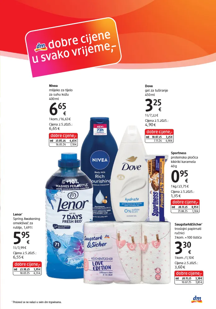 saugstark&sicher * troslojni papirnati ručnici 3 kom. × 100 listića 3 30 € 1 kom. / 1,10 € cijena 2.5.2025.: 3,60 € od 20.11.25 3,30 € 10.07.25 3,85 € sportness proteinska pločica kikiriki karamela 40 g 0 95 € 1 kg / 23,75 € cijena 2.5.2025.: 1,35 € od 20.11.25 0,95 € 21.08.25 1,10 € nivea mlijeko za tijelo za suhu kožu 400 ml 6 65 € 1 kom. / 16,63 € cijena 2.5.2025.: 6,65 € od 23.05.24 6,65 € 16.05.24 7,10 € dove gel za tuširanje 450 ml 3 25 € 1 l / 7,22 € cijena 2.5.2025.: 4,90 € od 10.07.25 3,25 € 7.11.24 4,90 € lenor * spring awakening omekšivač za rublje, 1,491 l 5 95 € 1 l / 3,99 € cijena 2.5.2025.: 6,55 € od 23.10.25 5,95 € 18.03.25 6,55 € * proizvod se ne nalazi u svim dm trgovinama.
