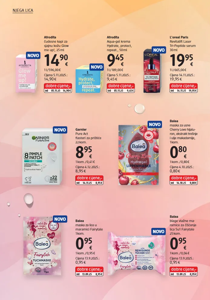 l'oreal paris revitalift laser tri-peptide serum 30 ml 19 95 € 1 l / 665,00 € cijena 14.11.2025.: 19,95 € od 14.11.25 19,95 € afrodita čudesne kapi za sjajnu kožu glow me up!, 25 ml 14 90 € 1 l / 596,00 € cijena 5.11.2025.: 14,90 € od 05.11.25 14,90 € garnier pure act flasteri za prištiće 22 kom. 8 95 € 1 kom. / 0,41 € cijena 4.12.2025.: 8,95 € od 14.11.25 8,95 € balea maska za usne cherry love hijalu- ron, ekstrakt trešnje i ulje makadamije, 1 kom. 0 80 € 1 kom. / 0,80 € cijena 4.10.2025.: 0,80 € od 14.10.25 0,80 € balea maska za lice u maramici fairytale 1 kom. 0 95 € 1 kom. / 0,95 € cijena 13.9.2025.: 0,95 € od 13.09.25 0,95 € balea blage vlažne ma- ramice za čišćenje lica 5u1 fairytale 25 kom. 0 95 € 1 kom. / 0,04 € cijena 13.9.2025.: 0,95 € od 13.09.25 0,95 € afrodita aqua-gel krema hydrate, protect, repeat., 50 ml 9 45 € 1 l / 189,00 € cijena 5.11.2025.: 9,45 € od 05.11.25 9,45 € novo novo novo novo novo novo novo njega lica