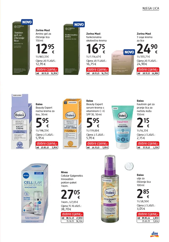 nivea cellular epigenetics innovation poklon-paket 1 kom. 27 05 € 1 kom. / 27,05 € cijena 15.10.2025.: 38,70 € od 08.12.25 27,05 € 15.10.25 38,70 € balea ulje za čišćenje lica 100 ml 2 85 € 1 l / 28,50 € cijena 2.5.2025.: 3,05 € od 09.05.24 2,85 € 25.05.23 3,05 € novo novo novo zorina mast amino gel za čišćenje lica 150 ml 12 95 € 1 l / 863,33 € cijena 20.11.2025.: 12,95 € od 20.11.25 12,95 € balea beauty expert noćna krema za lice, 30 ml 5 95 € 1 l / 198,33 € cijena 2.5.2025.: 5,95 € od 25.05.23 5,95 € balea beauty expert serum-krema s vitaminom c i e spf 30, 50 ml 5 95 € 1 l / 119,00 € cijena 2.5.2025.: 5,95 € od 24.11.23 5,95 € balea hautrein gel za pranje lica za nečistu kožu 150 ml 2 15 € 1 l /14,33 € cijena 2.5.2025.: 2,15 € od 17.11.23 2,15 € zorina mast funkcionalna okoloočna krema 16 75 € 1 l / 1.116,67 € cijena 20.11.2025.: 16,75 € od 20.11.25 16,75 € zorina mast 3 soya krema za lice 24 90 € 1 l / 355,71 € cijena 20.11.2025.: 24,90 € od 20.11.25 24,90 € njega lica