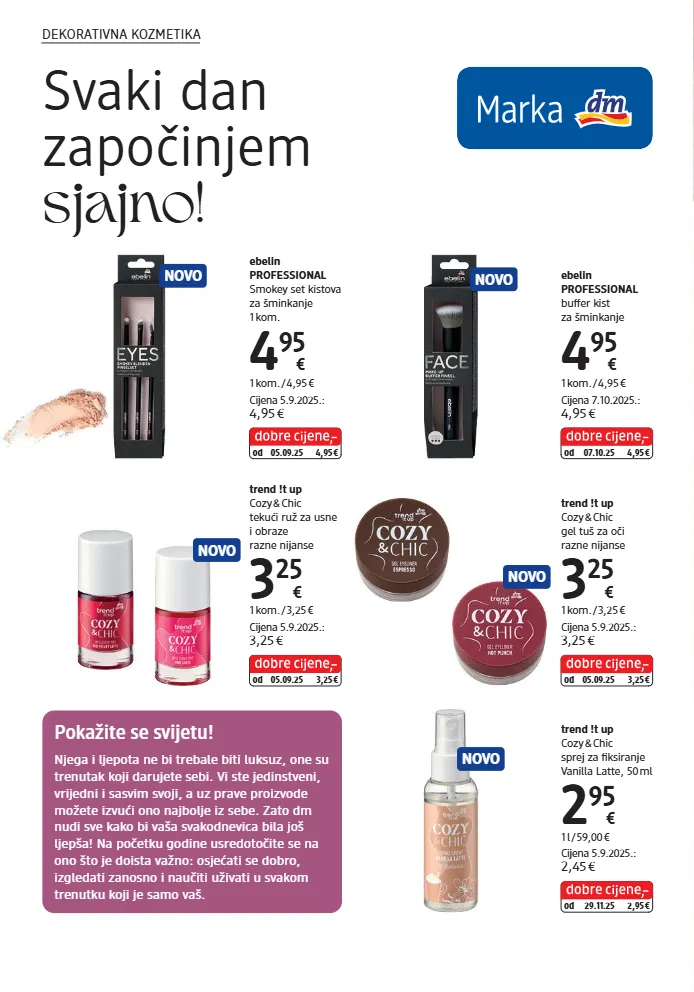 ebelin PROFESSIONAL Smokey set kistova za šminkanje 1 kom. 4 95 € 1 kom. / 4,95 € Cijena 5.9.2025.: 4,95 € od 05.09.25 4,95 € ebelin PROFESSIONAL buffer kist za šminkanje 4 95 € 1 kom. / 4,95 € Cijena 7.10.2025.: 4,95 € od 07.10.25 4,95 € trend !t up Cozy & Chic tekući ruž za usne i obraze razne nijanse 3 25 € 1 kom. / 3,25 € Cijena 5.9.2025.: 3,25 € od 05.09.25 3,25 € trend !t up Cozy & Chic sprej za fiksiranje Vanilla Latte, 50 ml 2 95 € 1 l / 59,00 € Cijena 5.9.2025.: 2,45 € od 29.11.25 2,95 € trend !t up Cozy & Chic gel tuš za oči razne nijanse 3 25 € 1 kom. / 3,25 € Cijena 5.9.2025.: 3,25 € od 05.09.25 3,25 € NOVO NOVO NOVO NOVO NOVO Pokažite se svijetu! Njega i ljepota ne bi trebale biti luksuz, one su trenutak koji darujete sebi. Vi ste jedinstveni, vrijedni i sasvim svoji, a uz prave proizvode možete izvući ono najbolje iz sebe. Zato dm nudi sve kako bi vaša svakodnevica bila još ljepša! Na početku godine usredotočite se na ono što je doista važno: osjećati se dobro, izgledati zanosno i naučiti uživati u svakom trenutku koji je samo vaš. Svaki dan započinjem sjajno! DEKORATIVNA KOZMETIKA