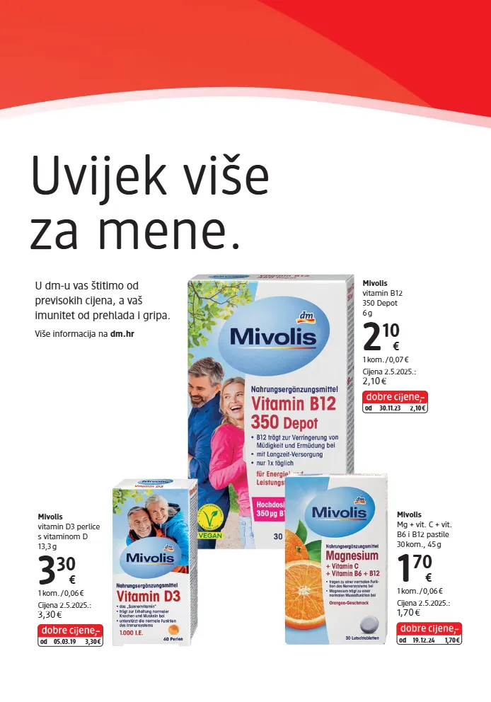 Mivolis vitamin D3 perlice s vitaminom D 13,3 g 3 30 € 1 kom. / 0,06 € Cijena 2.5.2025.: 3,30 € od 05.03.19 3,30 € Mivolis vitamin B12 350 Depot 6 g 2 10 € 1 kom. / 0,07 € Cijena 2.5.2025.: 2,10 € od 30.11.23 2,10 € Mivolis Mg + vit. C + vit. B6 i B12 pastile 30 kom., 45 g 1 70 € 1 kom. / 0,06 € Cijena 2.5.2025.: 1,70 € od 19.12.24 1,70 € Uvijek više za mene. U dm-u vas štitimo od previsokih cijena, a vaš imunitet od prehlada i gripa. Više informacija na dm.hr
