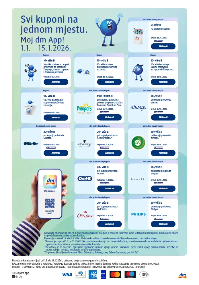 ponuda u katalogu vrijedi od 1.1. do 15.1.2026., odnosno do prodaje osiguranih količina. iskazane cijene proizvoda u katalogu / katalogu express sadrže prikaz i informaciju datuma kad je nastupila promjena cijene proizvoda. u nekim trgovinama, zbog ograničenog prostora, nisu dostupni pojedini proizvodi. ne odgovaramo za tiskarske pogreške. kupon 10x više bodova pri kupnji ruževa, sjajila i olovaka za usne 10x više b s ovim kuponom ostvarujete 10x više bodova pri kupnji ruževa, sjajila i olovaka za usne vrijedi do 30.11.2025. aktivirati dm active beauty kupon aktivirati 5× više b na ukupnu kupnju. * vrijedi do 31.1.2026. active beauty kupon 10x više bodova pri kupnji ruževa, sjajila i olovaka za usne 10x više b s ovim kuponom ostvarujete 10x više bodova pri kupnji ruževa, sjajila i olovaka za usne vrijedi do 30.11.2025. aktivirati kupon aktivirati 10× više b 10× više bodova pri kupnji proizvoda za njegu i čišćenje lica. vrijedi do 15.1.2026. kupon 10x više bodova pri kupnji ruževa, sjajila i olovaka za usne 10x više b s ovim kuponom ostvarujete 10x više bodova pri kupnji ruževa, sjajila i olovaka za usne vrijedi do 30.11.2025. aktivirati kupon aktivirati 10× više b 10× više bodova pri kupnji proizvoda za sport i mr- šavljenje, instant napitaka i dodataka prehrani. vrijedi do 15.1.2026. kupon 10x više bodova pri kupnji ruževa, sjajila i olovaka za usne 10x više b s ovim kuponom ostvarujete 10x više bodova pri kupnji ruževa, sjajila i olovaka za usne vrijedi do 30.11.2025. aktivirati kupon aktivirati 10× više b 10× više bodova pri kupnji proizvoda za bebe. ** vrijedi do 15.1.2026. kupon 10x više bodova pri kupnji ruževa, sjajila i olovaka za usne 10x više b s ovim kuponom ostvarujete 10x više bodova pri kupnji ruževa, sjajila i olovaka za usne vrijedi do 30.11.2025. aktivirati kupon aktivirati 10× više b 10× više bodova pri kupnji deterdženata za rublje. vrijedi do 15.1.2026. kupon 10x više bodova pri kupnji ruževa, sjajila i olovaka za usne 10x više b s ovim kuponom ostvarujete 10x više bodova pri kupnji ruževa, sjajila i olovaka za usne vrijedi do 30.11.2025. aktivirati dm active beauty kupon aktivirati 1500 extra b pri kupnji 2 pakiranja pelena i/ili pelena-gaćica pampers premium care. vrijedi do 15.1.2026. active beauty kupon 10x više bodova pri kupnji ruževa, sjajila i olovaka za usne 10x više b s ovim kuponom ostvarujete 10x više bodova pri kupnji ruževa, sjajila i olovaka za usne vrijedi do 30.11.2025. aktivirati dm active beauty kupon aktivirati 20× više b pri kupnji proizvoda always. vrijedi do 15.1.2026. active beauty kupon 10x više bodova pri kupnji ruževa, sjajila i olovaka za usne 10x više b s ovim kuponom ostvarujete 10x više bodova pri kupnji ruževa, sjajila i olovaka za usne vrijedi do 30.11.2025. aktivirati dm active beauty kupon aktivirati 20× više b pri kupnji proizvoda gillette. vrijedi do 15.1.2026. active beauty kupon 10x više bodova pri kupnji ruževa, sjajila i olovaka za usne 10x više b s ovim kuponom ostvarujete 10x više bodova pri kupnji ruževa, sjajila i olovaka za usne vrijedi do 30.11.2025. aktivirati dm active beauty kupon aktivirati 20× više b pri kupnji proizvoda schwarzkopf. *** vrijedi do 15.1.2026. active beauty kupon 10x više bodova pri kupnji ruževa, sjajila i olovaka za usne 10x više b s ovim kuponom ostvarujete 10x više bodova pri kupnji ruževa, sjajila i olovaka za usne vrijedi do 30.11.2025. aktivirati dm active beauty kupon aktivirati 20× više b pri kupnji proizvoda airwick. vrijedi do 15.1.2026. active beauty kupon 10x više bodova pri kupnji ruževa, sjajila i olovaka za usne 10x više b s ovim kuponom ostvarujete 10x više bodova pri kupnji ruževa, sjajila i olovaka za usne vrijedi do 30.11.2025. aktivirati dm active beauty kupon aktivirati 20× više b pri kupnji proizvoda oral-b. vrijedi do 15.1.2026. active beauty kupon 10x više bodova pri kupnji ruževa, sjajila i olovaka za usne 10x više b s ovim kuponom ostvarujete 10x više bodova pri kupnji ruževa, sjajila i olovaka za usne vrijedi do 30.11.2025. aktivirati dm active beauty kupon aktivirati 20× više b pri kupnji proizvoda bugatti. vrijedi do 15.1.2026. active beauty kupon 10x više bodova pri kupnji ruževa, sjajila i olovaka za usne 10x više b s ovim kuponom ostvarujete 10x više bodova pri kupnji ruževa, sjajila i olovaka za usne vrijedi do 30.11.2025. aktivirati dm active beauty kupon aktivirati 20× više b pri kupnji proizvoda philips. vrijedi do 15.1.2026. active beauty kupon 10x više bodova pri kupnji ruževa, sjajila i olovaka za usne 10x više b s ovim kuponom ostvarujete 10x više bodova pri kupnji ruževa, sjajila i olovaka za usne vrijedi do 30.11.2025. aktivirati dm active beauty kupon aktivirati 20× više b pri kupnji proizvoda old spice. vrijedi do 15.1.2026. active beauty svi kuponi na jednom mjestu. moj dm app! 1.1. - 15.1.2026. aktivirajte ekupone na dm.hr ili putem dm aplikacije. ekupon je moguće iskoristiti samo jedanput u dm trgovini ili dm online shopu uz predočenje dm active beauty kartice. promocije traju od 1.1. do 15.1.2026. ili do isteka zaliha u navedenom razdoblju u dm trgovini i dm online shopu. * promocija traje od 1.1. do 31.1.2026. ne odnosi se na kupnju dm darovnih kartica, povratnu naknadu za ambalažu s jednokratnom upotrebom te početne i specijalne dojenačke formule. ** ne odnosi se na početne i specijalne dojenačke formule, dječje igračke, slikovnice, dječji tekstil, dječje poklon-pakete, sredstva za pranje rublja i posuđa, inhalatore te ušne toplomjere. *** u promociji sudjeluju brendovi gliss, schauma, palette, live, crème supreme, got2b i taft. moj dm app dm.hr