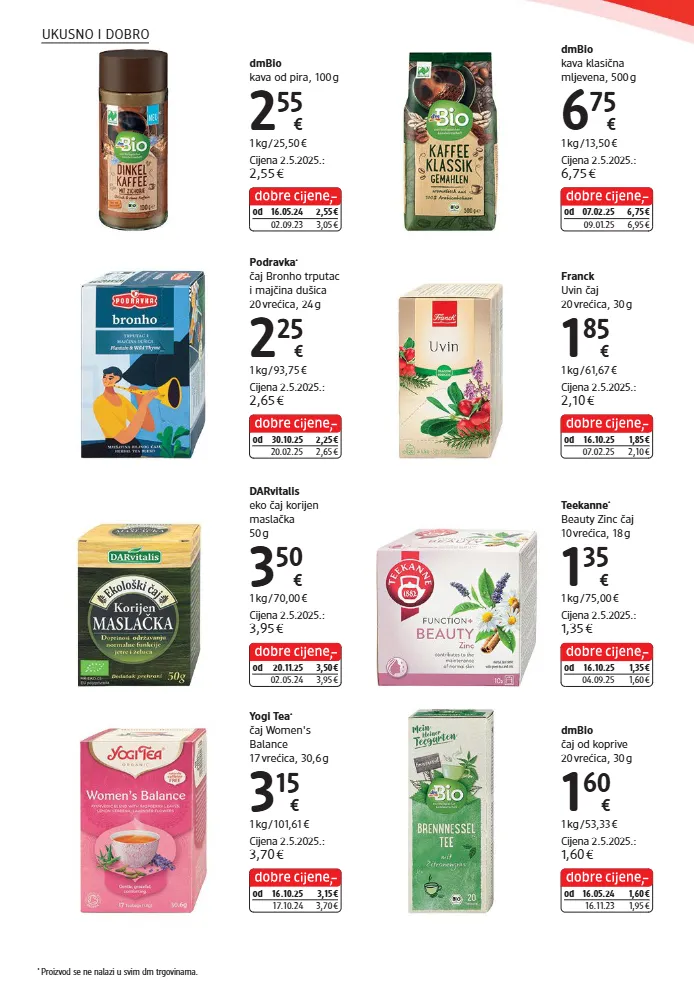 podravka * čaj bronho trputac i majčina dušica 20 vrećica, 24 g 2 25 € 1 kg / 93,75 € cijena 2.5.2025.: 2,65 € od 30.10.25 2,25 € 20.02.25 2,65 € darvitalis eko čaj korijen maslačka 50 g 3 50 € 1 kg / 70,00 € cijena 2.5.2025.: 3,95 € od 20.11.25 3,50 € 02.05.24 3,95 € yogi tea * čaj women's balance 17 vrećica, 30,6 g 3 15 € 1 kg / 101,61 € cijena 2.5.2025.: 3,70 € od 16.10.25 3,15 € 17.10.24 3,70 € dmbio čaj od koprive 20 vrećica, 30 g 1 60 € 1 kg / 53,33 € cijena 2.5.2025.: 1,60 € od 16.05.24 1,60 € 16.11.23 1,95 € teekanne * beauty zinc čaj 10 vrećica, 18 g 1 35 € 1 kg / 75,00 € cijena 2.5.2025.: 1,35 € od 16.10.25 1,35 € 04.09.25 1,60 € franck uvin čaj 20 vrećica, 30 g 1 85 € 1 kg / 61,67 € cijena 2.5.2025.: 2,10 € od 16.10.25 1,85 € 07.02.25 2,10 € dmbio kava od pira, 100 g 2 55 € 1 kg / 25,50 € cijena 2.5.2025.: 2,55 € od 16.05.24 2,55 € 02.09.23 3,05 € dmbio kava klasična mljevena, 500 g 6 75 € 1 kg / 13,50 € cijena 2.5.2025.: 6,75 € od 07.02.25 6,75 € 09.01.25 6,95 € * proizvod se ne nalazi u svim dm trgovinama. ukusno i dobro