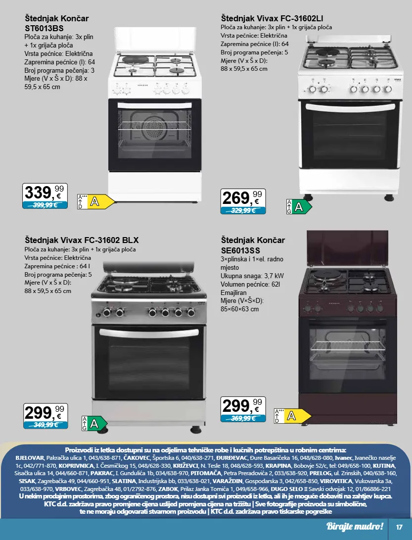 Proizvodi iz letka dostupni su na odjelima tehničke robe i kućnih potrepština u robnim centrima: BJELOVAR , Pakračka ulica 1, 043/638-871, ČAKOVEC , Športska 6, 040/638-271, ĐURĐEVAC , Đure Basaričeka 16, 048/628-080, Ivanec , Ivanečko naselje 1c, 042/771-870, KOPRIVNICA , I. Česmičkog 15, 048/628-330, KRIŽEVCI , N. Tesle 18, 048/628-593, KRAPINA , Bobovje 52/c, tel: 049/658-100, KUTINA , Sisačka ulica 14, 044/660-871, PAKRAC , I. Gundulića 1b, 034/638-970, PITOMAČA , Petra Preradovića 2, 033/638-920, PRELOG , ul. Zrinskih, 040/638-160, SISAK , Zagrebačka 49, 044/660-951, SLATINA , Industrijska bb, 033/638-021, VARAŽDIN , Gospodarska 3, 042/658-850, VIROVITICA , Vukovarska 3a, 033/638-970, VRBOVEC , Zagrebačka 48, 01/2792-876, ZABOK , Prilaz Janka Tomića 1, 049/658-966, DUGO SELO II Savski odvojak 12, 01/86886-221 U nekim prodajnim prostorima, zbog ograničenog prostora, nisu dostupni svi proizvodi iz letka, ali ih je moguće dobaviti na zahtjev kupca. KTC d.d. zadržava pravo promjene cijena uslijed promjena cijena na tržištu | Sve fotografije proizvoda su simbolične, te ne moraju odgovarati stvarnom proizvodu | KTC d.d. zadržava pravo tiskarske pogreške 299 , 99 € 369,99 € 339 , 99 € 399,99 € 269 , 99 € 329,99 € 299 , 99 € 349,99 € Birajte mudro! 17 Štednjak Končar SE6013SS 3×plinska i 1×el. radno mjesto Ukupna snaga: 3,7 kW Volumen pećnice: 62l Emajliran Mjere (V׊×D): 85×60×63 cm Štednjak Končar ST6013BS Ploča za kuhanje: 3x plin + 1x grijača ploča Vrsta pećnice: Električna Zapremina pećnice (l): 64 Broj programa pečenja: 3 Mjere (V x Š x D): 88 x 59,5 x 65 cm Štednjak Vivax FC-31602LI Ploča za kuhanje: 3x plin + 1x grijača ploča Vrsta pećnice: Električna Zapremina pećnice (l): 64 Broj programa pečenja: 5 Mjere (V x Š x D): 88 x 59,5 x 65 cm Štednjak Vivax FC-31602 BLX Ploča za kuhanje: 3x plin + 1x grijača ploča Vrsta pećnice: Električna Zapremina pećnice : 64 l Broj programa pečenja: 5 Mjere (V x Š x D): 88 x 59,5 x 65 cm