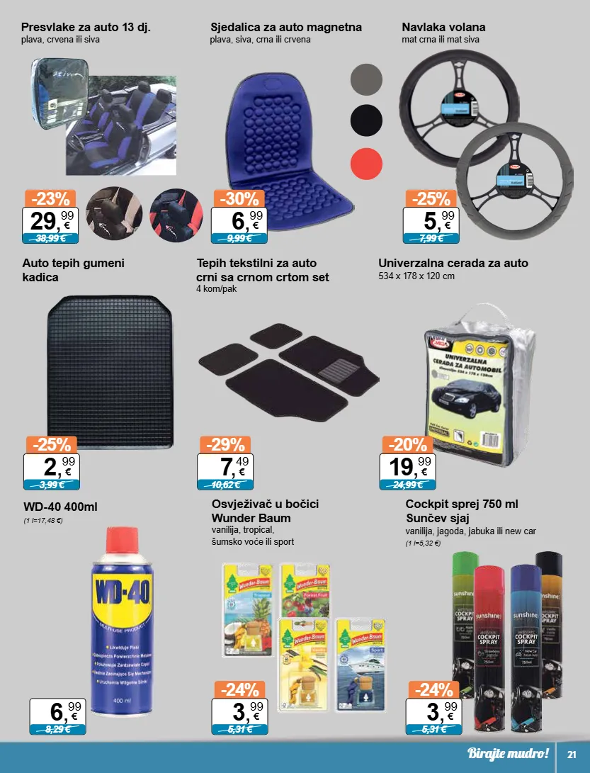 6 , 99 € 8,29 € -23% 38,99 € 29 , 99 € -30% 9,99 € 6 , 99 € -25% 7,99 € 5 , 99 € -29% 10,62 € 7 , 49 € -20% 24,99 € 19 , 99 € -25% 3,99 € 2 , 99 € -24% 5,31 € 3 , 99 € -24% 5,31 € 3 , 99 € birajte mudro! 21 presvlake za auto 13 dj. plava, crvena ili siva sjedalica za auto magnetna plava, siva, crna ili crvena navlaka volana mat crna ili mat siva tepih tekstilni za auto crni sa crnom crtom set 4 kom/pak univerzalna cerada za auto 534 x 178 x 120 cm auto tepih gumeni kadica wd-40 400ml (1 l=17,48 €) osvježivač u bočici wunder baum vanilija, tropical, šumsko voće ili sport cockpit sprej 750 ml sunčev sjaj vanilija, jagoda, jabuka ili new car (1 l=5,32 €)