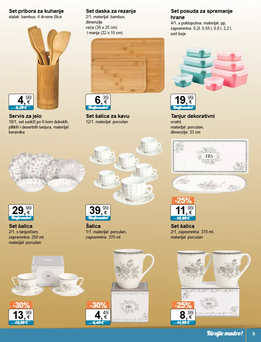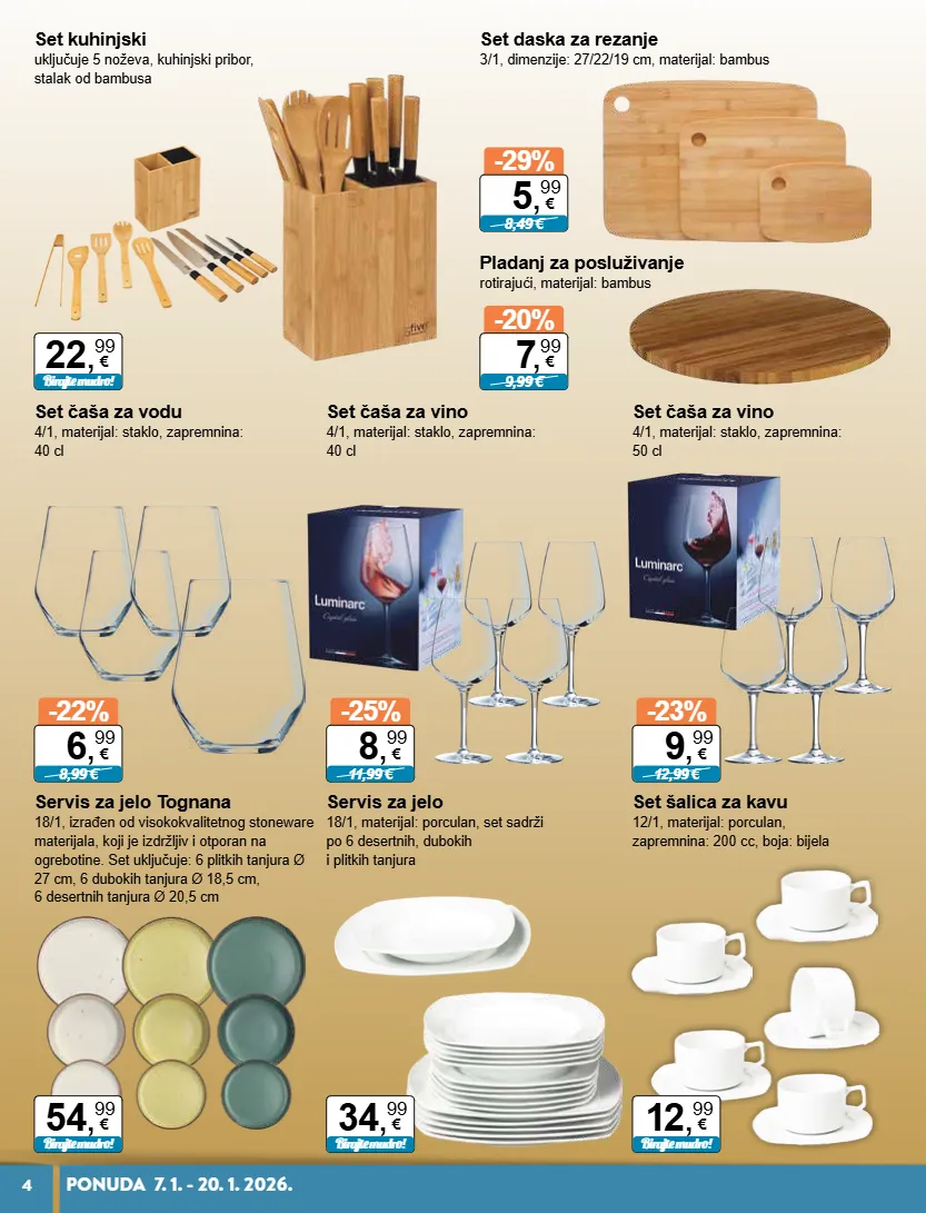 22 , 99 € birajte mudro! 54 , 99 € birajte mudro! 34 , 99 € birajte mudro! 12 , 99 € birajte mudro! -29% 8,49 € 5 , 99 € -20% 9,99 € 7 , 99 € -22% 8,99 € 6 , 99 € -25% 11,99 € 8 , 99 € -23% 12,99 € 9 , 99 € 4 ponuda 7. 1. - 20. 1. 2026. set kuhinjski uključuje 5 noževa, kuhinjski pribor, stalak od bambusa set daska za rezanje 3/1, dimenzije: 27/22/19 cm, materijal: bambus pladanj za posluživanje rotirajući, materijal: bambus set čaša za vodu 4/1, materijal: staklo, zapremnina: 40 cl set čaša za vino 4/1, materijal: staklo, zapremnina: 40 cl set čaša za vino 4/1, materijal: staklo, zapremnina: 50 cl servis za jelo tognana 18/1, izrađen od visokokvalitetnog stoneware materijala, koji je izdržljiv i otporan na ogrebotine. set uključuje: 6 plitkih tanjura ø 27 cm, 6 dubokih tanjura ø 18,5 cm, 6 desertnih tanjura ø 20,5 cm servis za jelo 18/1, materijal: porculan, set sadrži po 6 desertnih, dubokih i plitkih tanjura set šalica za kavu 12/1, materijal: porculan, zapremnina: 200 cc, boja: bijela