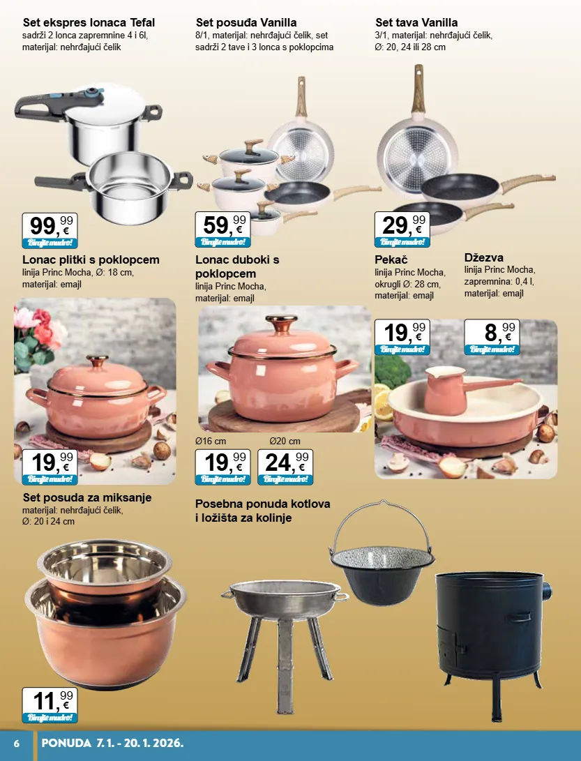 99 , 99 € birajte mudro! 11 , 99 € birajte mudro! 59 , 99 € birajte mudro! 29 , 99 € birajte mudro! 19 , 99 € birajte mudro! 19 , 99 € birajte mudro! 24 , 99 € birajte mudro! 19 , 99 € birajte mudro! 8 , 99 € birajte mudro! ø16 cm ø20 cm 6 ponuda 7. 1. - 20. 1. 2026. set ekspres lonaca tefal sadrži 2 lonca zapremnine 4 i 6l, materijal: nehrđajući čelik set posuda za miksanje materijal: nehrđajući čelik, ø: 20 i 24 cm posebna ponuda kotlova i ložišta za kolinje set posuđa vanilla 8/1, materijal: nehrđajući čelik, set sadrži 2 tave i 3 lonca s poklopcima set tava vanilla 3/1, materijal: nehrđajući čelik, ø: 20, 24 ili 28 cm lonac plitki s poklopcem linija princ mocha, ø: 18 cm, materijal: emajl lonac duboki s poklopcem linija princ mocha, materijal: emajl pekač linija princ mocha, okrugli ø: 28 cm, materijal: emajl džezva linija princ mocha, zapremnina: 0,4 l, materijal: emajl
