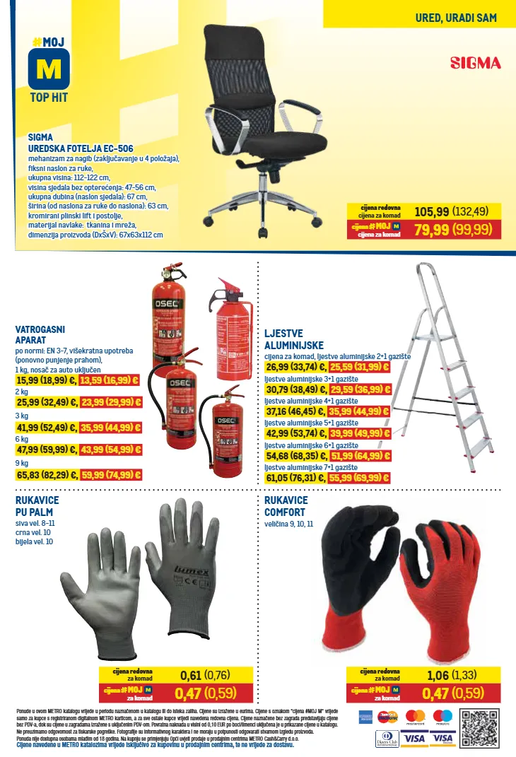 top hit moj cijena redovna cijena za komad 105,99 (132,49) cijena moj cijena za komad 79,99 (99,99) cijena redovna za komad 0,61 (0,76) cijena moj za komad 0,47 (0,59) rukavice pu palm siva vel. 8-11 crna vel. 10 bijela vel. 10 rukavice comfort veličina 9, 10, 11 cijena redovna za komad 1,06 (1,33) cijena moj za komad 0,47 (0,59) sigma uredska fotelja ec-506 mehanizam za nagib (zaključavanje u 4 položaja), fiksni naslon za ruke, ukupna visina: 112-122 cm, visina sjedala bez opterećenja: 47-56 cm, ukupna dubina (naslon sjedala): 67 cm, širina (od naslona za ruke do naslona): 63 cm, kromirani plinski lift i postolje, materijal navlake: tkanina i mreža, dimenzija proizvoda (dxšxv): 67x63x112 cm ponude u ovom metro katalogu vrijede u periodu naznačenom u katalogu ili do isteka zaliha. cijene su izražene u eurima. cijene s oznakom “cijena #moj m“ vrijede samo za kupce s registriranom digitalnom metro karticom, a za sve ostale kupce vrijedi navedena redovna cijena. cijene naznačene bez zagrada predstavljaju cijene bez pdv-a, dok su cijene u zagradama izražene s uključenim pdv-om. povratna naknada u visini od 0,10 eur po boci/limenci uključena je u prikazane cijene u katalogu. ne preuzimamo odgovornost za tiskarske pogreške. fotografije su informativnog karaktera i ne moraju u potpunosti odgovarati stvarnom izgledu proizvoda. ponuda nije dostupna osobama mlađim od 18 godina. na kupnju se primjenjuju opći uvjeti prodaje u prodajnim centrima metro cash&carry d.o.o. cijene navedene u metro katalozima vrijede isključivo za kupovinu u prodajnim centrima, te ne vrijede za dostavu. ured, uradi sam ljestve aluminijske cijena za komad, ljestve aluminijske 2+1 gazište 26,99 (33,74) €, 25,59 (31,99) € ljestve aluminijske 3+1 gazište 30,79 (38,49) €, 29,59 (36,99) € ljestve aluminijske 4+1 gazište 37,16 (46,45) €, 35,99 (44,99) € ljestve aluminijske 5+1 gazište 42,99 (53,74) €, 39,99 (49,99) € ljestve aluminijske 6+1 gazište 54,68 (68,35) €, 51,99 (64,99) € ljestve aluminijske 7+1 gazište 61,05 (76,31) €, 55,99 (69,99) € vatrogasni aparat po normi: en 3-7, višekratna upotreba (ponovno punjenje prahom), 1 kg, nosač za auto uključen 15,99 (18,99) €, 13,59 (16,99) € 2 kg 25,99 (32,49) €, 23,99 (29,99) € 3 kg 41,99 (52,49) €, 35,99 (44,99) € 6 kg 47,99 (59,99) €, 43,99 (54,99) € 9 kg 65,83 (82,29) €, 59,99 (74,99) €