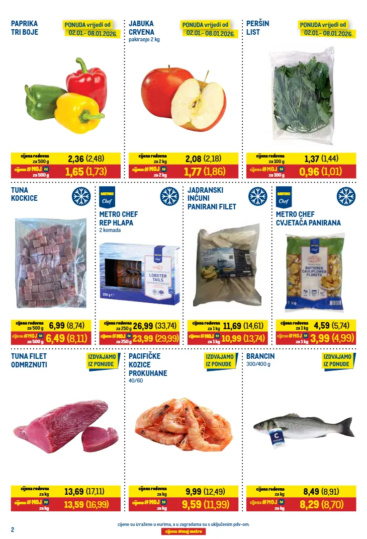 2 cijene su izražene u eurima, a u zagradama su s uključenim pdv-om. cijena # moj metro metro chef cvjetača panirana peršin list jabuka crvena pakiranje 2 kg paprika tri boje jadranski inćuni panirani filet metro chef rep hlapa 2 komada tuna kockice brancin 300/400 g tuna filet odmrznuti pacifičke kozice prokuhane 40/60 cijena redovna za kg 9,99 (12,49) cijena moj za kg 9,59 (11,99) cijena redovna za 100 g 1,37 (1,44) za 100 g 0,96 (1,01) cijena redovna za 2 kg 2,08 (2,18) cijena moj za 2 kg 1,77 (1,86) cijena redovna za 500 g 2,36 (2,48) cijena moj za 500 g 1,65 (1,73) cijena redovna za 250 g 26,99 (33,74) cijena moj za 250 g 23,99 (29,99) cijena redovna za 1 kg 11,69 (14,61) cijena moj za 1 kg 10,99 (13,74) ponuda vrijedi od 02.01.- 08.01.2026. ponuda vrijedi od 02.01.- 08.01.2026. ponuda vrijedi od 02.01.- 08.01.2026. cijena redovna za 500 g 6,99 (8,74) za 500 g 6,49 (8,11) cijena redovna za 1 kg 4,59 (5,74) za 1 kg 3,99 (4,99) cijena redovna za kg 13,69 (17,11) cijena moj za kg 13,59 (16,99) cijena redovna za kg 8,49 (8,91) za kg 8,29 (8,70)