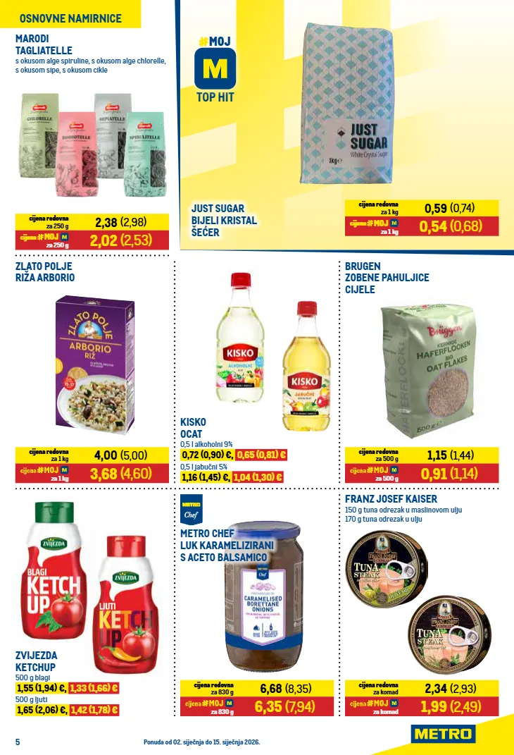5 ponuda od 02. siječnja do 15. siječnja 2026. marodi tagliatelle s okusom alge spiruline, s okusom alge chlorelle, s okusom sipe, s okusom cikle just sugar bijeli kristal šećer kisko ocat 0,5 l alkoholni 9% 0,72 (0,90) €, 0,65 (0,81) € 0,5 l jabučni 5% 1,16 (1,45) €, 1,04 (1,30) € zvijezda ketchup 500 g blagi 1,55 (1,94) €, 1,33 (1,66) € 500 g ljuti 1,65 (2,06) €, 1,42 (1,78) € metro chef luk karamelizirani s aceto balsamico franz josef kaiser 150 g tuna odrezak u maslinovom ulju 170 g tuna odrezak u ulju zlato polje riža arborio brugen zobene pahuljice cijele top hit moj cijena redovna za 1 kg 0,59 (0,74) cijena moj za 1 kg 0,54 (0,68) cijena redovna za 250 g 2,38 (2,98) cijena moj za 250 g 2,02 (2,53) osnovne namirnice cijena redovna za 1 kg 4,00 (5,00) za 1 kg 3,68 (4,60) cijena redovna za 500 g 1,15 (1,44) za 500 g 0,91 (1,14) cijena redovna za 830 g 6,68 (8,35) za 830 g 6,35 (7,94) cijena redovna za komad 2,34 (2,93) za komad 1,99 (2,49)