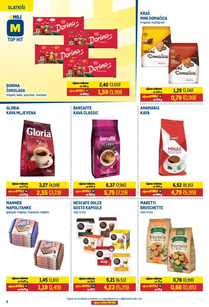 6 cijene su izraene u eurima, a u zagradama su s uključenim pdv-om. cijena # moj metro maretti bruschette više vrsta nescafe dolce gusto kapsule više vrsta dorina čokolada mlijeko, keks, speculas, noissete anamaria kava kraš mini domaćica original, multigrain gloria kava mljevena barcaffe kava classic top hit moj manner napolitanke lješnjak-mlijeko, čokolada-mlijeko cijena redovna za 5x25 g 1,45 (1,81) cijena moj za 5x25 g 1,19 (1,49) cijena redovna za 100 g 1,25 (1,56) cijena moj za 100 g 0,79 (0,99) cijena redovna za 160 g 2,40 (3,00) za 160 g 1,59 (1,99) cijena redovna za 70 g 0,78 (0,98) za 70 g 0,68 (0,85) cijena redovna za 175 g 3,27 (4,09) za 175 g 2,55 (3,19) cijena redovna za 400 g 6,37 (7,96) za 400 g 5,75 (7,19) slatkiši cijena redovna za 400 g 6,52 (8,15) cijena moj za 400 g 4,79 (5,99) cijena redovna za 16/1 5,21 (6,51) za 16/1 4,23 (5,29)