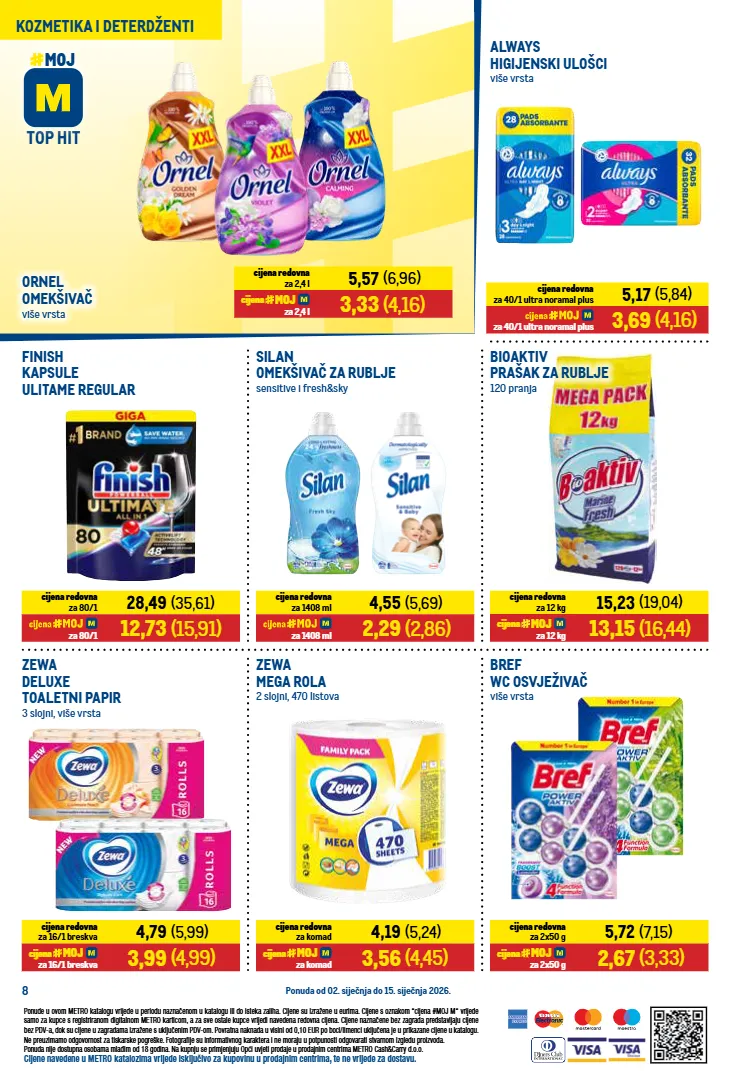 ponuda od 02. siječnja do 15. siječnja 2026. 8 top hit moj ponude u ovom metro katalogu vrijede u periodu naznačenom u katalogu ili do isteka zaliha. cijene su izražene u eurima. cijene s oznakom “cijena #moj m“ vrijede samo za kupce s registriranom digitalnom metro karticom, a za sve ostale kupce vrijedi navedena redovna cijena. cijene naznačene bez zagrada predstavljaju cijene bez pdv-a, dok su cijene u zagradama izražene s uključenim pdv-om. povratna naknada u visini od 0,10 eur po boci/limenci uključena je u prikazane cijene u katalogu. ne preuzimamo odgovornost za tiskarske pogreške. fotografije su informativnog karaktera i ne moraju u potpunosti odgovarati stvarnom izgledu proizvoda. ponuda nije dostupna osobama mlađim od 18 godina. na kupnju se primjenjuju opći uvjeti prodaje u prodajnim centrima metro cash&carry d.o.o. cijene navedene u metro katalozima vrijede isključivo za kupovinu u prodajnim centrima, te ne vrijede za dostavu. bioaktiv prašak za rublje 120 pranja bref wc osvježivač više vrsta zewa mega rola 2 slojni, 470 listova ornel omekšivač više vrsta cijena redovna za 40/1 ultra noramal plus 5,17 (5,84) za 40/1 ultra noramal plus 3,69 (4,16) always higijenski ulošci više vrsta finish kapsule ulitame regular silan omekšivač za rublje sensitive i fresh&sky zewa deluxe toaletni papir 3 slojni, više vrsta cijena redovna za 80/1 28,49 (35,61) za 80/1 12,73 (15,91) kozmetika i deterdženti cijena redovna za 2,4 l 5,57 (6,96) cijena moj za 2,4 l 3,33 (4,16) cijena redovna za 12 kg 15,23 (19,04) cijena moj za 12 kg 13,15 (16,44) cijena redovna za 16/1 breskva 4,79 (5,99) cijena moj za 16/1 breskva 3,99 (4,99) cijena redovna za 1408 ml 4,55 (5,69) za 1408 ml 2,29 (2,86) cijena redovna za 2x50 g 5,72 (7,15) cijena moj za 2x50 g 2,67 (3,33) cijena redovna za komad 4,19 (5,24) cijena moj za komad 3,56 (4,45)