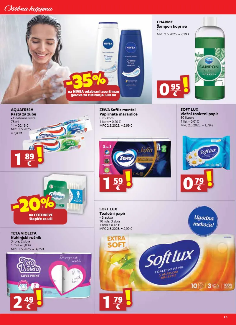 13 osobna higijena -35% -35% na nivea odabrani asortiman gelova za tuširanje 500 ml -35% -20% na cotoneve štapiće za uši teta violeta kuhinjski ručnik 3 role, 2 sloja 1 rola = 0,83 € mpc 2.5.2025. = 4,25 € aquafresh pasta za zube • odabrane vrste 75 ml 1 l = 20,13 € mpc 2.5.2025. = 3,49 € soft lux vlažni toaletni papir 60 listova 1 list = 0,01€ mpc 2.5.2025. = 1,79 € soft lux toaletni papir • breskva 10 rola, 3 sloja 1 rola = 0,18 € mpc 2.5.2025. = 2,99 € charme šampon kopriva 1 l mpc 2.5.2025. = 2,29 € zewa softis mentol papirnate maramice 8 x 9 kom 1 kom = 0,20 € mpc 2.5.2025. = 2,99 € 2 49 ! ! 1 89 ! ! 0 79 ! ! 1 79 ! ! 0 95 ! ! 1 59 ! !