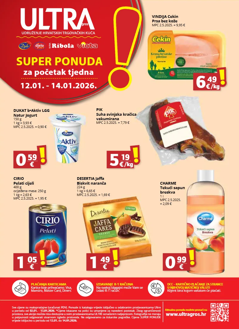 plaćanja karticama kartice koje prihvaćamo: visa, maestro, master card, diners izdavanje r-1 računa na svakoj blagajni može vam se izdati r-1 račun. dcc – kartično plaćanje za strance u njihovoj matičnoj valuti klijent bira kojom valutom će plaćati. sve cijene su maloprodajne (uračunat pdv). ponude iz kataloga vrijede isključivo u odabranim prodavaonicama ultre u periodu od 02.01. - 13.01.2026. *cijene iskazane na polici su umanjene za navedeni postotak. zbog ograničenosti prostora, sve akcije možda nisu dostupne u svim prodavaonicama ultre označenim naljepnicom. fotografije ne moraju u potpunosti odgovarati stvarnom izgledu proizvoda. ne odgovaramo za tiskarske pogreške. cijene super ponude vrijede iskljucivo u periodu od 12.01. do 14.01.2026. aktualnu ponudu možete pronaći na www.ultragros.hr ! ! 12.01. - 14.01.2026. super ponuda za početak tjedna cirio pelati cijeli 400 g ocijeđena masa: 250 g 1 kg = 2,63 € mpc 2.5.2025. = 1,95 € vindija cekin prsa bez kože mpc 2.5.2025. = 9,95 € pik suha svinjska kračica vakumirana mpc 2.5.2025. = 7,79 € dukat b•aktiv lgg natur jogurt 150 g 1 kg = 3,93 € mpc 2.5.2025. = 0,90 € desertia jaffa biskvit naranča 224 g 1 kg = 6,65 € mpc 2.5.2025. = 1,69 € 1 05 ! ! 0 59 ! ! 1 49 ! ! 6 49 ! ! /kg 5 19 ! ! /kg charme tekući sapun breskva 1 l mpc 2.5.2025. = 2,09 € 0 99 ! !