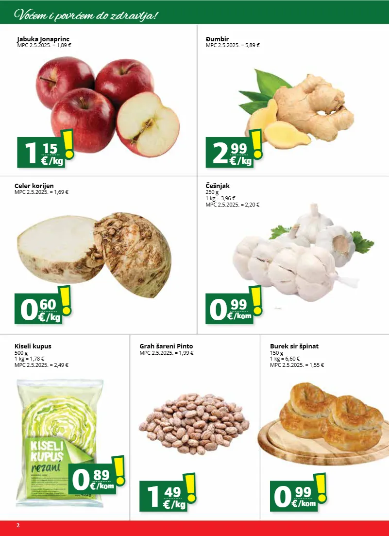 2 voćem i povrćem do zdravlja! 2 99 ! ! /kg 0 60 ! ! /kg 1 49 ! ! /kg 1 15 ! ! /kg 0 99 ! ! /kom 0 89 ! ! /kom 0 99 ! ! /kom đumbir mpc 2.5.2025. = 5,89 € celer korijen mpc 2.5.2025. = 1,69 € kiseli kupus 500 g 1 kg = 1,78 € mpc 2.5.2025. = 2,49 € grah šareni pinto mpc 2.5.2025. = 1,99 € burek sir špinat 150 g 1 kg = 6,60 € mpc 2.5.2025. = 1,55 € jabuka jonaprinc mpc 2.5.2025. = 1,89 € češnjak 250 g 1 kg = 3,96 € mpc 2.5.2025. = 2,20 €