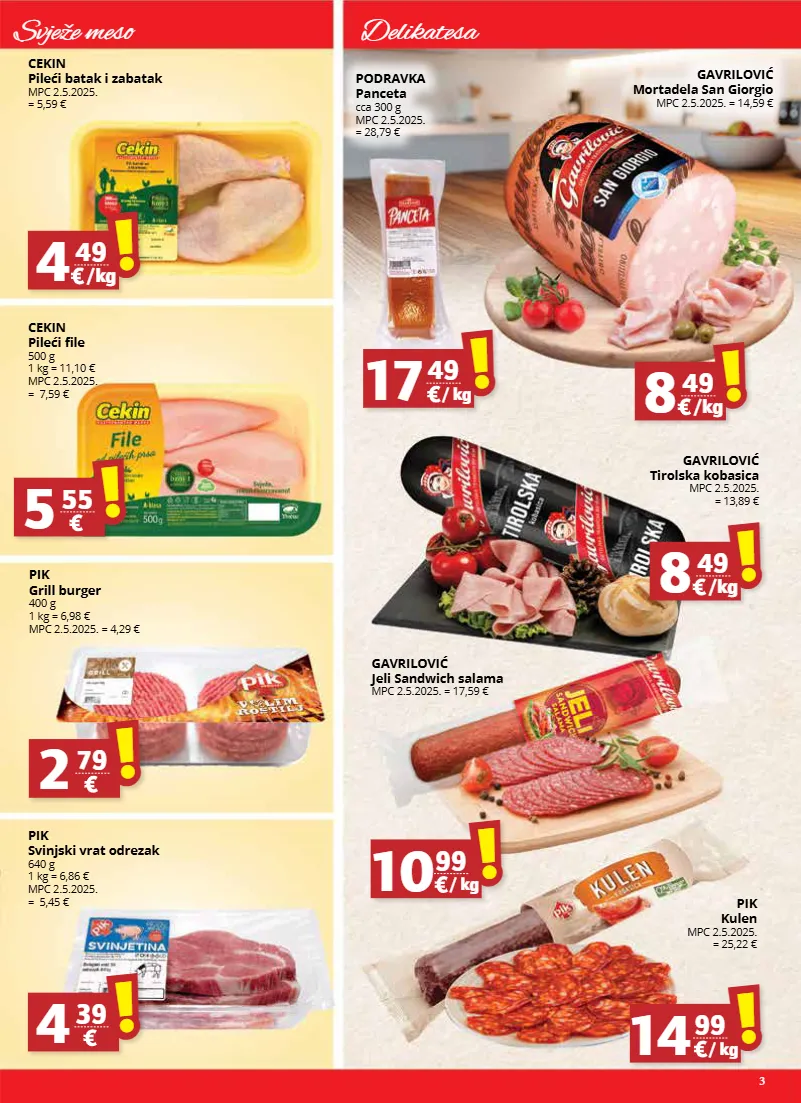 3 delikatesa svježe meso cekin pileći file 500 g 1 kg = 11,10 € mpc 2.5.2025. = 7,59 € pik grill burger 400 g 1 kg = 6,98 € mpc 2.5.2025. = 4,29 € pik svinjski vrat odrezak 640 g 1 kg = 6,86 € mpc 2.5.2025. = 5,45 € cekin pileći batak i zabatak mpc 2.5.2025. = 5,59 € 4 49 ! ! /kg 5 55 ! ! 2 79 ! ! 4 39 ! ! gavrilović mortadela san giorgio mpc 2.5.2025. = 14,59 € gavrilović tirolska kobasica mpc 2.5.2025. = 13,89 € gavrilović jeli sandwich salama mpc 2.5.2025. = 17,59 € pik kulen mpc 2.5.2025. = 25,22 € 14 99 ! ! /kg 10 99 ! ! /kg 8 49 ! ! /kg 8 49 ! ! /kg podravka panceta cca 300 g mpc 2.5.2025. = 28,79 € 17 49 ! ! /kg