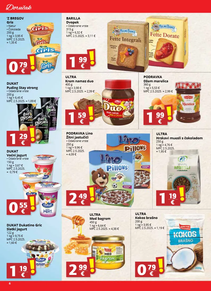 6 doručak ultra hrskavi muesli s čokoladom 250 g 1 kg = 4,76 € mpc 2.5.2025. = 1,95 € podravka lino žitni jastučići • odabrane vrste 250 g 1 kg = 9,96 € mpc 2.5.2025. = 4,09 € podravka džem marelica 360 g 1 kg = 5,53 € mpc 2.5.2025. = 2,99 € barilla dvopek • odabrane vrste 315 g 1 kg = 6,32 € mpc 2.5.2025. = 3,11 € ultra med bagrem 450 g 1 kg = 6,64 € mpc 2.5.2025. = 4,38 € 1 19 ! ! 2 49 ! ! 1 99 ! ! 1 99 ! ! 2 99 ! ! ‘z bregov gris • natur • čokolada 200 g 1 kg = 3,95 € mpc 2.5.2025. = 1,35 € dukat dukatino gric slatki jogurt 122 g 1 kg = 9,75 € mpc 2.5.2025. = 1,60 € 0 79 ! ! 1 19 ! ! ultra kokos brašno 200 g 1 kg = 3,95 € mpc 2.5.2025. = 1,19 € 0 79 ! ! dukat voćni jogurt • odabrane vrste 150 g 1 kg = 3,67 € mpc 2.5.2025. = 0,79 € 0 55 ! ! dukat puding stay strong • odabrane vrste 200 g 1 kg = 6,45 € mpc 2.5.2025. = 1,89 € 1 29 ! ! ultra krem namaz duo 400 g 1 kg = 3,98 € mpc 2.5.2025. = 2,39 € 1 59 ! !