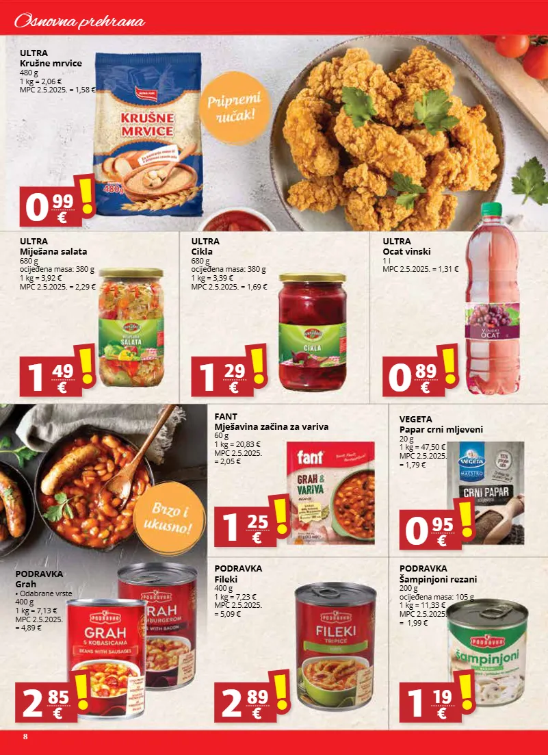 7 osnovna prehrana smrznuto ledo krumpir pommes frites 1 kg mpc 2.5.2025. = 5,59 € ledo panirani riblji štapići 300 g 1 kg = 7,97 € mpc 2.5.2025. = 3,69 € ledo bob 400 g 1 kg = 5,73 € mpc 2.5.2025. = 3,69€ ledo brokula 400 g 1 kg = 5,48 € mpc 2.5.2025. = 3,19 € ledo snjeguljica 5+1 390 ml 1 l = 9,72 € 1 kom = 0,76 € mpc 2.5.2025. = 6,95 € 3 39 ! ! 2 39 ! ! 2 29 ! ! 2 19 ! ! 3 79 ! ! thomy senf blagi tuba 200 g 1 kg = 8,45 € mpc 2.5.2025. = 2,78 € 1 69 ! ! -15% -15% na maggi juhe odabrani asortiman -15% -15% na cetina tjesteninu podravka juha • odabrane vrste 62 g 1 kg = 12,74 € mpc 2.5.2025. = 1,19 € 0 79 ! ! sant andrea riža 500 g 1 kg = 3,98 € mpc 2.5.2025. = 3,11 € 1 99 ! ! podravka koncentrat rajčice 190 g 1 kg = 9,21 € mpc 2.5.2025. = 2,75 € 1 75 ! ! smrznuto smrznuto smrznuto smrznuto smrznuto