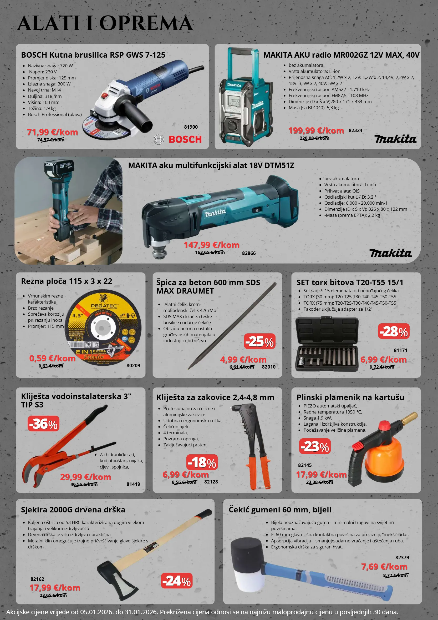 74,57 €/kom 74,57 €/kom 0,63 €/kom 0,63 €/kom 46,56 €/kom 46,56 €/kom 23,65 €/kom 23,65 €/kom 8,77 €/kom 8,77 €/kom 6,61 €/kom 6,61 €/kom 8,56 €/kom 8,56 €/kom 9,72 €/kom 9,72 €/kom 23,38 €/kom 23,38 €/kom 220,08 €/kom 220,08 €/kom 163,65 €/kom 163,65 €/kom -25 -25 % % -18 -18 % % -24 -24 % % -36 -36 % % -28 -28 % % -23 -23 % % 6,99 €/kom 6,99 €/kom 17,99 €/kom 17,99 €/kom piezo automatski upaljač, radna temperatura 1350 °c, snaga 1,9 kw, lagana i izdržljiva konstrukcija, podešavanje veličine plamena. bosch kutna brusilica rsp gws 7-125 rezna ploča 115 x 3 x 22 kliješta vodoinstalaterska 3" tip s3 sjekira 2000g drvena drška čekić gumeni 60 mm, bijeli špica za beton 600 mm sds max draumet kliješta za zakovice 2,4-4,8 mm set torx bitova t20-t55 15/1 plinski plamenik na kartušu nazivna snaga: 720 w napon: 230 v promjer diska: 125 mm izlazna snaga: 300 w navoj trna: m14 duljina: 318 mm visina: 103 mm težina: 1.9 kg bosch professional (plava) vrhunskim rezne karakteristike brzo rezanje sprečava koroziju pri rezanju inoxa promjer: 115 mm kaljena oštrica od 53 hrc karakterizirana dugim vijekom trajanja i velikom izdržljivošću drvena drška je vrlo izdržljiva i praktična metalni klin omogućuje trajno pričvršćivanje glave sjekire s drškom bijela neoznačavajuća guma – minimalni tragovi na svijetlim površinama. fi 60 mm glava – šira kontaktna površina za precizniji, “mekši” udar. apsorpcija vibracija – smanjuje udarno vraćanje i oštećenja ruba. ergonomska drška za siguran hvat. za hidraulički rad, kod otpuštanja vijaka, cijevi, spojnica, alatni čelik, krom- molibdenski čelik 42crmo sds max držač za teške bušilice i udarne čekiće obradu betona i ostalih građevinskih materijala u industriji i obrtništvu profesionalno za čelične i aluminijske zakovice udobna i ergonomska ručka, čelično tijelo 4 terminala, povratna opruga, zaključavajući prsten. set sadrži 15 elemenata od nehrđajućeg čelika torx (30 mm): t20-t25-t30-t40-t45-t50-t55 torx (75 mm): t20-t25-t30-t40-t45-t50-t55 također uključuje adapter za 1/2" 71,99 €/kom 71,99 €/kom 0,59 €/kom 0,59 €/kom 29,99 €/kom 29,99 €/kom 17,99 €/kom 17,99 €/kom 7,69 €/kom 7,69 €/kom 4,99 €/kom 4,99 €/kom 6,99 €/kom 6,99 €/kom 81900 80209 81419 82162 82379 82010 82128 81171 82145 alati i oprema makita aku radio mr002gz 12v max, 40v makita aku multifunkcijski alat 18v dtm51z bez akumalatora vrsta akumulatora: li-ion prijenosna snaga ac: 1,2w x 2, 12v: 1,2w x 2, 14,4v: 2,2w x 2, 18v: 3,5w x 2, 40v: 5w x 2 frekvencijski raspon am522 - 1.710 khz frekvencijski raspon fm87,5 - 108 mhz dimenzije (d x š x v)280 x 171 x 434 mm masa (sa bl4040): 5,3 kg bez akumalatora vrsta akumulatora: li-ion prihvat alata: ois oscilacijski kut l / d: 3,2 ° oscilacije: 6.000 - 20.000 min-1 dimenzije (d x š x v): 326 x 80 x 122 mm -masa (prema epta): 2,2 kg 199,99 €/kom 199,99 €/kom 147,99 €/kom 147,99 €/kom 82324 82866 akcijske cijene vrijede od 05.01.2026. do 31.01.2026. prekrižena cijena odnosi se na najnižu maloprodajnu cijenu u posljednjih 30 dana.
