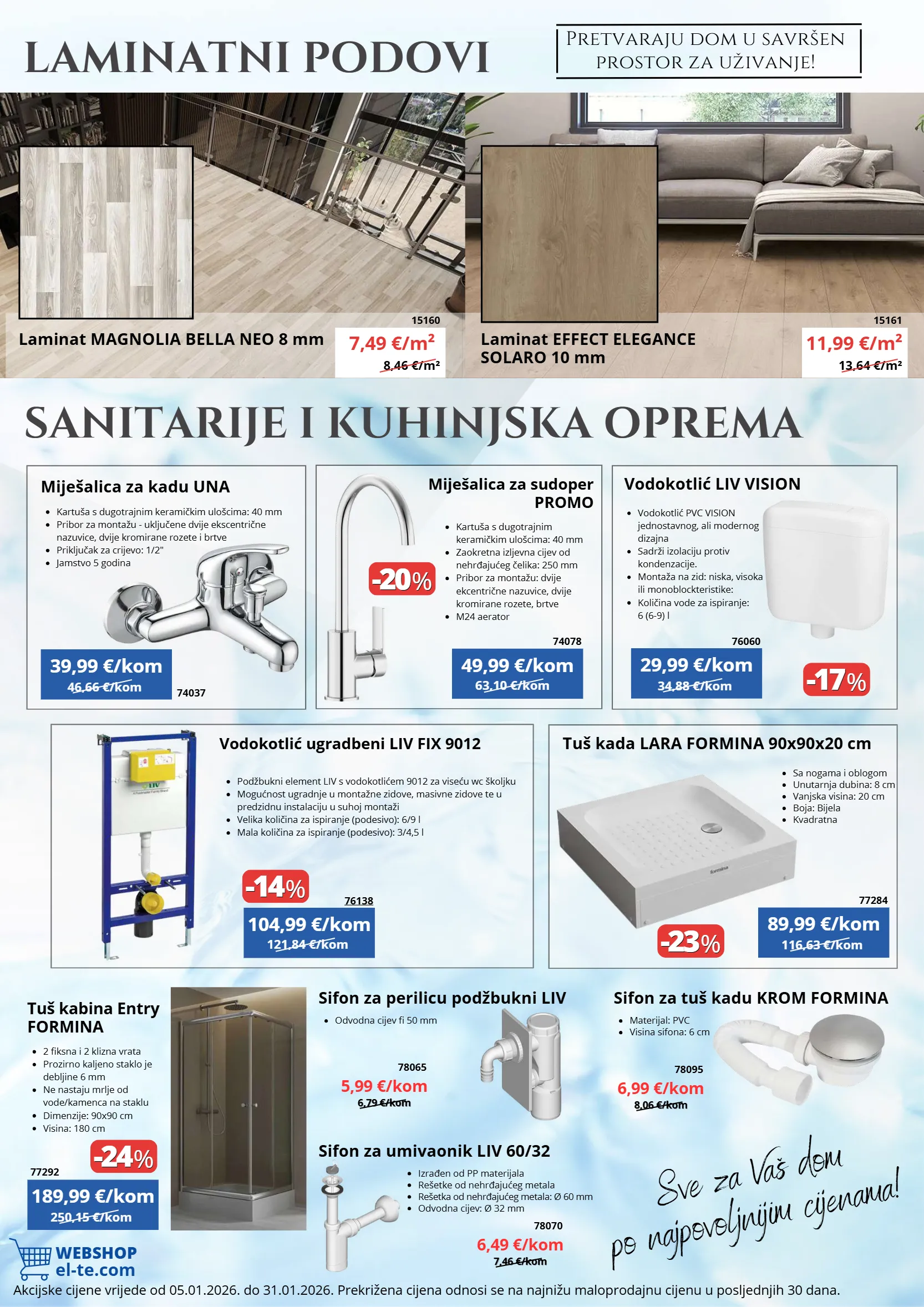 46,66 €/kom 250,15 €/kom 34,88 €/kom 116,63 €/kom -20 -20 % % -17 -17 % % -23 -23 % % 63,10 €/kom 121,84 €/kom webshop el-te.com 8,46 €/m² 13,64 €/m² -14 -14 % % -24 -24 % % 6,79 €/kom 6,79 €/kom 8,06 €/kom 8,06 €/kom 7,46 €/kom 7,46 €/kom sifon za perilicu podžbukni liv sifon za tuš kadu krom formina sifon za umivaonik liv 60/32 odvodna cijev fi 50 mm materijal: pvc visina sifona: 6 cm izrađen od pp materijala rešetke od nehrđajućeg metala rešetka od nehrđajućeg metala: ø 60 mm odvodna cijev: ø 32 mm akcijske cijene vrijede od 05.01.2026. do 31.01.2026. prekrižena cijena odnosi se na najnižu maloprodajnu cijenu u posljednjih 30 dana. miješalica za kadu una tuš kabina entry formina kartuša s dugotrajnim keramičkim ulošcima: 40 mm pribor za montažu - uključene dvije ekscentrične nazuvice, dvije kromirane rozete i brtve priključak za crijevo: 1/2" jamstvo 5 godina 2 fiksna i 2 klizna vrata prozirno kaljeno staklo je debljine 6 mm ne nastaju mrlje od vode/kamenca na staklu dimenzije: 90x90 cm visina: 180 cm 39,99 €/kom 189,99 €/kom 74037 vodokotlić liv vision tuš kada lara formina 90x90x20 cm vodokotlić pvc vision jednostavnog, ali modernog dizajna sadrži izolaciju protiv kondenzacije. montaža na zid: niska, visoka ili monoblockteristike: količina vode za ispiranje: 6 (6-9) l sa nogama i oblogom unutarnja dubina: 8 cm vanjska visina: 20 cm boja: bijela kvadratna 29,99 €/kom 89,99 €/kom 76060 77284 miješalica za sudoper promo vodokotlić ugradbeni liv fix 9012 49,99 €/kom 104,99 €/kom 74078 76138 77292 kartuša s dugotrajnim keramičkim ulošcima: 40 mm zaokretna izljevna cijev od nehrđajućeg čelika: 250 mm pribor za montažu: dvije ekcentrične nazuvice, dvije kromirane rozete, brtve m24 aerator podžbukni element liv s vodokotlićem 9012 za viseću wc školjku mogućnost ugradnje u montažne zidove, masivne zidove te u predzidnu instalaciju u suhoj montaži velika količina za ispiranje (podesivo): 6/9 l mala količina za ispiranje (podesivo): 3/4,5 l laminatni podovi laminat magnolia bella neo 8 mm laminat effect elegance solaro 10 mm 15160 15161 7,49 €/m² 11,99 €/m² sanitarije i kuhinjska oprema 78065 78095 78070 5,99 €/kom 6,99 €/kom 6,49 €/kom sve za vaš dom po najpovoljnijim cijenama! pretvaraju dom u savršen prostor za uživanje!