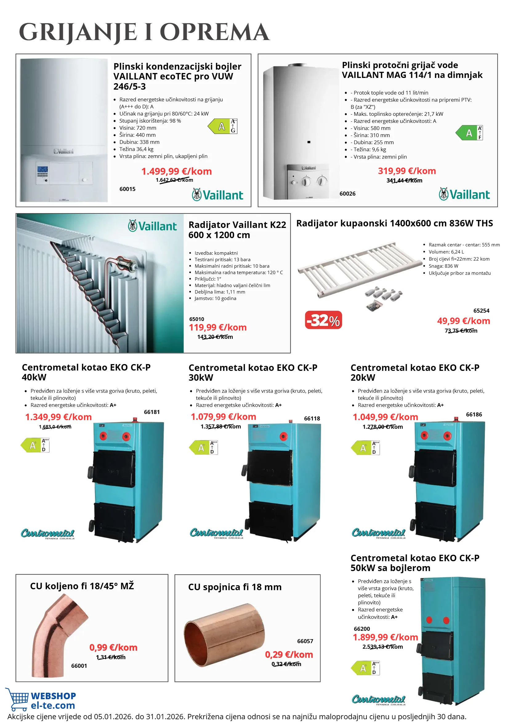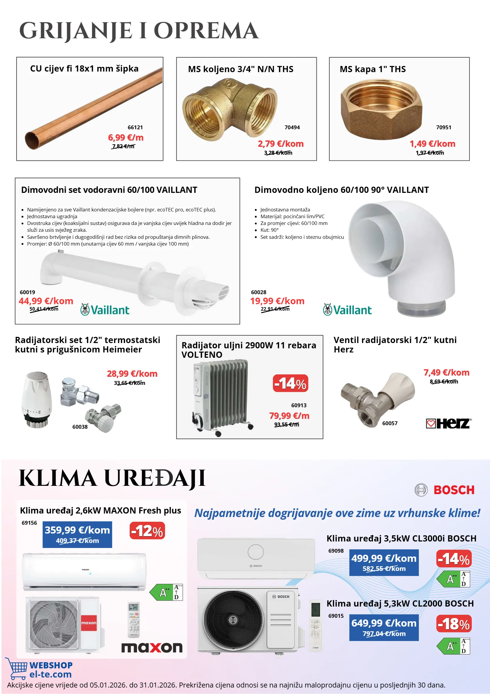 33,65 €/kom 33,65 €/kom 7,82 €/m 7,82 €/m 93,55 €/m 93,55 €/m 3,28 €/kom 3,28 €/kom 1,97 €/kom 1,97 €/kom 50,41 €/kom 22,91 €/kom -14 -14 % % -14 -14 % % -12 -12 % % -18 -18 % % 8,69 €/kom 8,69 €/kom webshop el-te.com 582,55 €/kom 409,37 €/kom 797,04 €/kom ++ ++ d a +++ ++ ++ d a +++ ++ ++ d a +++ akcijske cijene vrijede od 05.01.2026. do 31.01.2026. prekrižena cijena odnosi se na najnižu maloprodajnu cijenu u posljednjih 30 dana. namijenjeno za sve vaillant kondenzacijske bojlere (npr. ecotec pro, ecotec plus). jednostavna ugradnja dvostruka cijev (koaksijalni sustav) osigurava da je vanjska cijev uvijek hladna na dodir jer služi za usis svježeg zraka. savršeno brtvljenje i dugogodišnji rad bez rizika od propuštanja dimnih plinova. promjer: ø 60/100 mm (unutarnja cijev 60 mm / vanjska cijev 100 mm) jednostavna montaža materijal: pocinčani lim/pvc za promjer cijevi: 60/100 mm kut: 90° set sadrži: koljeno i steznu obujmicu grijanje i oprema radijatorski set 1/2" termostatski kutni s prigušnicom heimeier 60038 28,99 €/kom 28,99 €/kom cu cijev fi 18x1 mm šipka radijator uljni 2900w 11 rebara volteno 66121 60913 6,99 €/m 6,99 €/m 79,99 €/m 79,99 €/m ms koljeno 3/4" n/n ths ms kapa 1" ths 2,79 €/kom 2,79 €/kom 1,49 €/kom 1,49 €/kom 70494 70951 dimovodni set vodoravni 60/100 vaillant dimovodno koljeno 60/100 90° vaillant 44,99 €/kom 19,99 €/kom 60019 60028 ventil radijatorski 1/2" kutni herz 60057 7,49 €/kom 7,49 €/kom klima ure đ aji klima uređaj 3,5kw cl3000i bosch klima uređaj 2,6kw maxon fresh plus klima uređaj 5,3kw cl2000 bosch najpametnije dogrijavanje ove zime uz vrhunske klime! 499,99 €/kom 359,99 €/kom 649,99 €/kom 69098 69156 69015