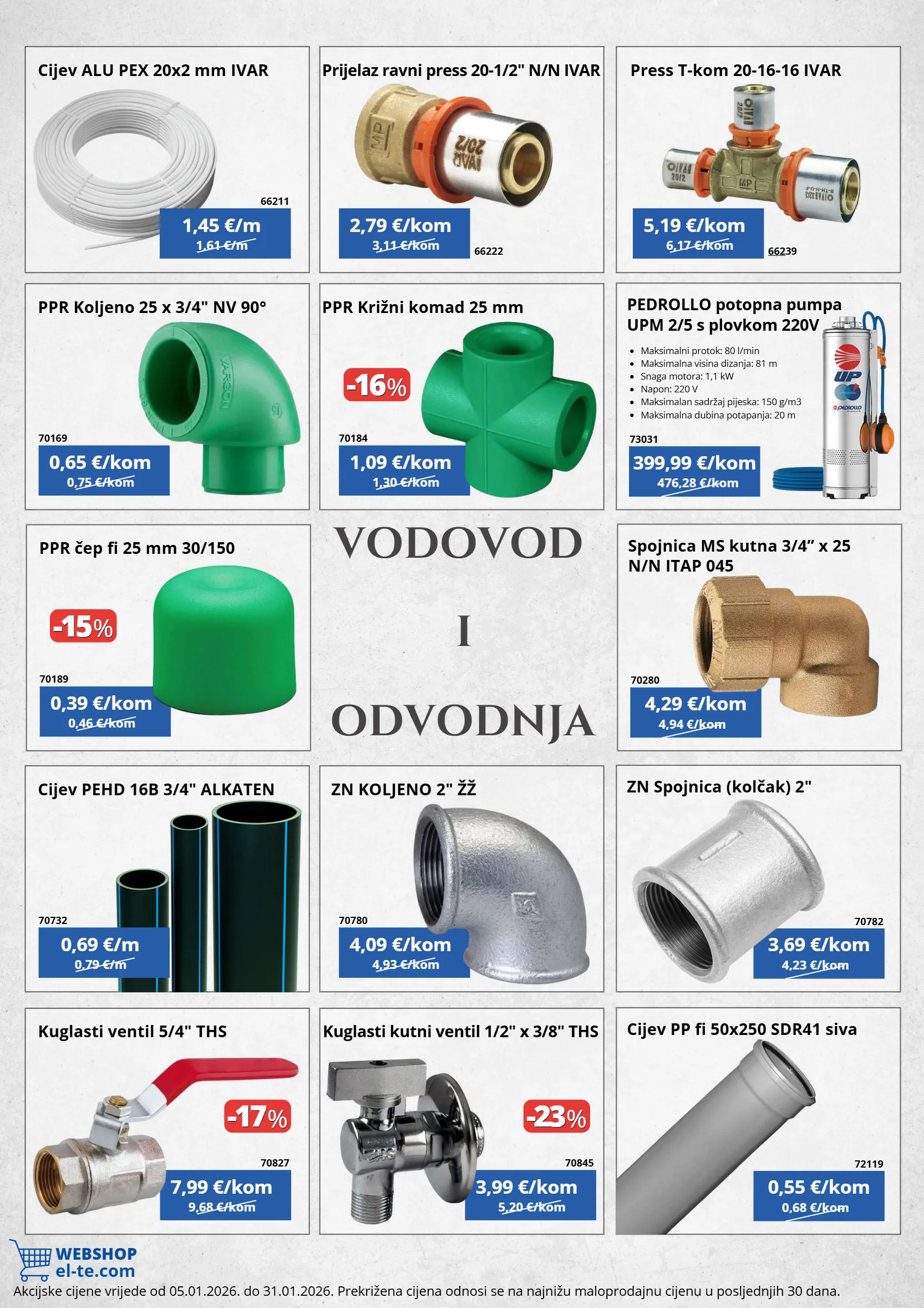 1,61 €/m 0,75 €/kom 0,79 €/m 9,68 €/kom 0,46 €/kom 3,11 €/kom 1,30 €/kom 4,93 €/kom 5,20 €/kom 6,17 €/kom 476,28 €/kom 4,23 €/kom 0,68 €/kom 4,94 €/kom -15 -15 % % -17 -17 % % -23 -23 % % -16 -16 % % webshop el-te.com cijev alu pex 20x2 mm ivar ppr koljeno 25 x 3/4" nv 90° cijev pehd 16b 3/4" alkaten kuglasti ventil 5/4" ths ppr čep fi 25 mm 30/150 prijelaz ravni press 20-1/2" n/n ivar ppr križni komad 25 mm zn koljeno 2" žž kuglasti kutni ventil 1/2" x 3/8" ths press t-kom 20-16-16 ivar 1,45 €/m 0,65 €/kom 0,69 €/m 7,99 €/kom 0,39 €/kom 2,79 €/kom 1,09 €/kom 4,09 €/kom 3,99 €/kom 5,19 €/kom 66211 70169 70732 70827 70189 66222 70184 70780 70845 66239 pedrollo potopna pumpa upm 2/5 s plovkom 220v zn spojnica (kolčak) 2" cijev pp fi 50x250 sdr41 siva spojnica ms kutna 3/4” x 25 n/n itap 045 maksimalni protok: 80 l/min maksimalna visina dizanja: 81 m snaga motora: 1,1 kw napon: 220 v maksimalan sadržaj pijeska: 150 g/m3 maksimalna dubina potapanja: 20 m 399,99 €/kom 3,69 €/kom 0,55 €/kom 4,29 €/kom 73031 70782 72119 70280 i vodovod odvodnja akcijske cijene vrijede od 05.01.2026. do 31.01.2026. prekrižena cijena odnosi se na najnižu maloprodajnu cijenu u posljednjih 30 dana.